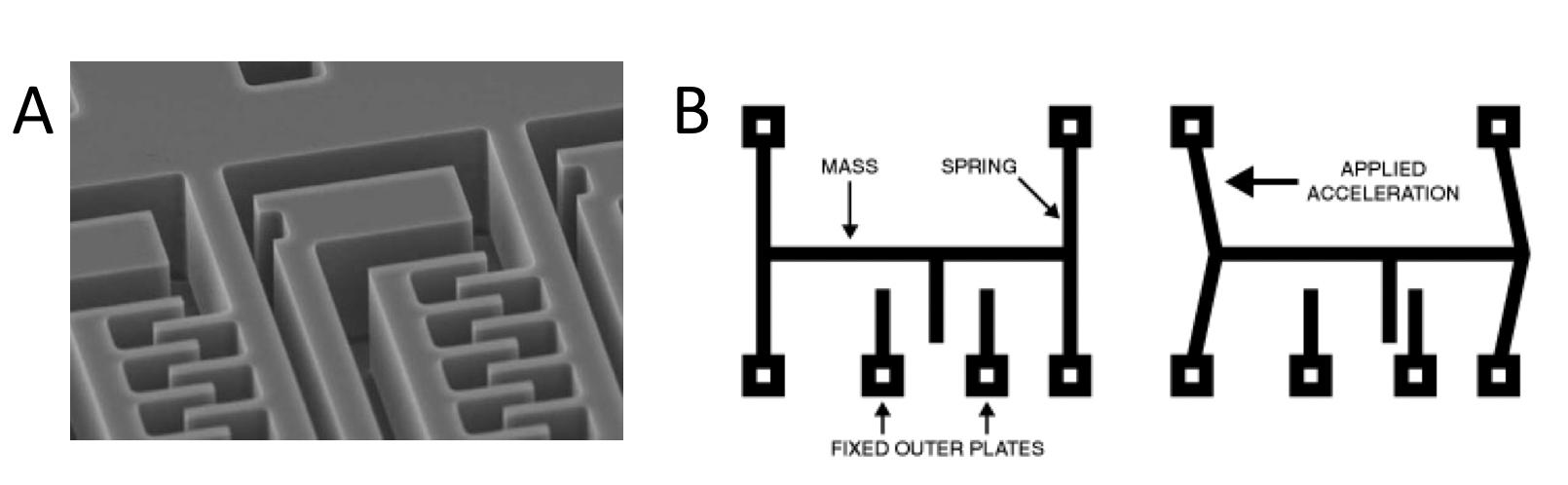 Fig.1.6: A-SEMimageofapartofaMEMS-accelerometerforairbag(ReprintedfromRef. [18],withpermissionfromIOPPublishing,Ltd,Copyright2022);Bprincipleoffunctioning oftheaccelerometer.