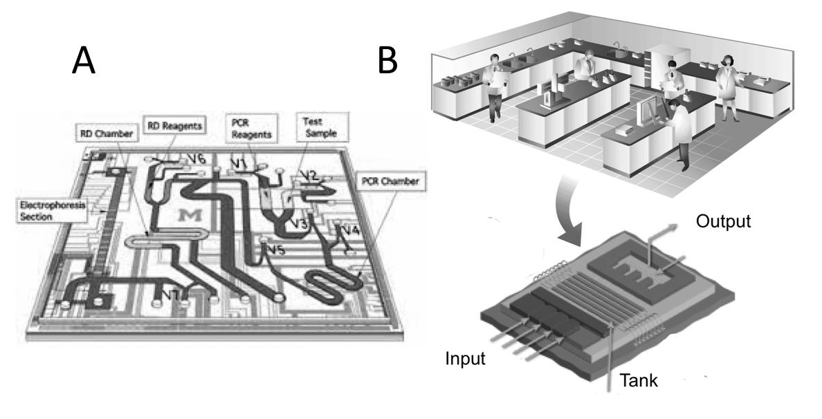 Fig.1.14: (A)Cartoonpublishedin1998[58],showinganimaginarymicrofluidicdeviceintegratingseveralfunctionalities:electrophoreticseparation,heating,driving,mixing,extraction,andpolymerasechainreaction(PCR)amplification.(B)ImageelaboratedbyCaliper, around2000,thatillustrateswellthelab-on-a-chipconcept.