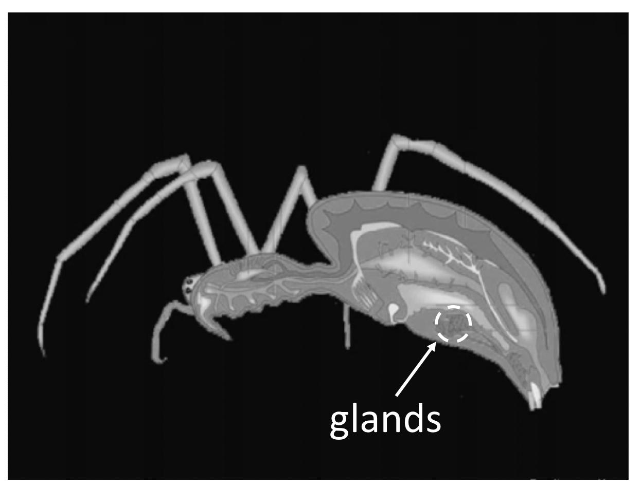 1.2: Twoglandsproducethesilkof thespiderweb,eachglandsecretinga particulartypeofsilk.Thesilkisina liquidstateintheglands.Duringits journeytowardstheoutlet,thesolutionhardensundertheeffectoflarge deformations,dehydrates,turnsinto asoftmaterial,exitsthespider,evaporates,andsolidifies.