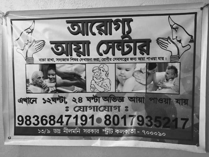 The second kind of ayahs’ advertisement in Kolkata offered caregiving services for the elderly and children. In a country where old peoples’ homes are still taboo and hospices are not well established, family members often hire ayahs to take responsibility of caring for elderly family members. Ayahs are also hired by nuclear families who prefer not to, or don’t have the means to, send their children to day care centres, which have only recently appeared in cities in developing countries such as Kolkata in India.