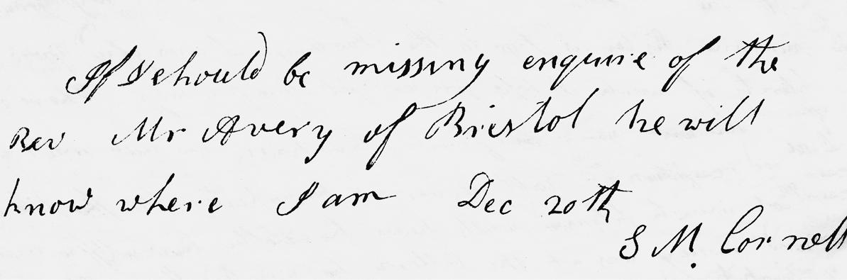 If I am missing inquire of Rev. Mr. Avery Bristol he will know where I am gone. S. M. Cornell. Dec. 20th