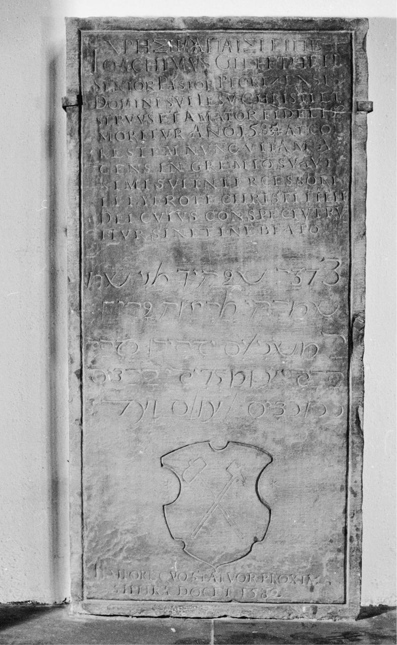 Accordingly, the reputation of the Joachimsthal Gifftheils was forged not in its mines and foundries but in its schools. The humanist education received by the family’s children allowed them to transcend their lowly social status. We know the stories of two; the brothers Joachim and Zacharias. Their acuity and zeal for the Lutheran faith were noticed and fostered by Mathesius, and through him, the brothers Gifftheil could claim a direct connection to the founding father of their faith. The eldest, Joachim, was named after the township’s patron saint.10 Born in the mid-1530s, he studied liberal arts and theology in Wittenberg from 1551. After being ordained as a Lutheran minister, he occupied a series of pastorates in Saxony and Thuringia.11 Although learned, the ‘strong willed’ pastor was a stickler for church discipline and often ran afoul of authorities. For instance, in Schmalkalden in 1556, he refused to take a wife, which was otherwise a requirement for the office. In 1574 Joachim was invited to Pforzheim to become court preacher to Karl II, Margrave of Baden-Durlach.12 There he authored books on a variety of religious subjects in Latin and German, several of which appeared on the papal index.13 He died in 1585. The motifs on his gravestone in St. Martin’s Church in Pforzheim (Fig. 2.1), which unite the miner’s pickaxe and hammer with Greek, Hebrew, and Latin encomia, emblematise the improbable, rapid ascent of the Gifftheil family from menial Bohemian labourers to clerical elite.