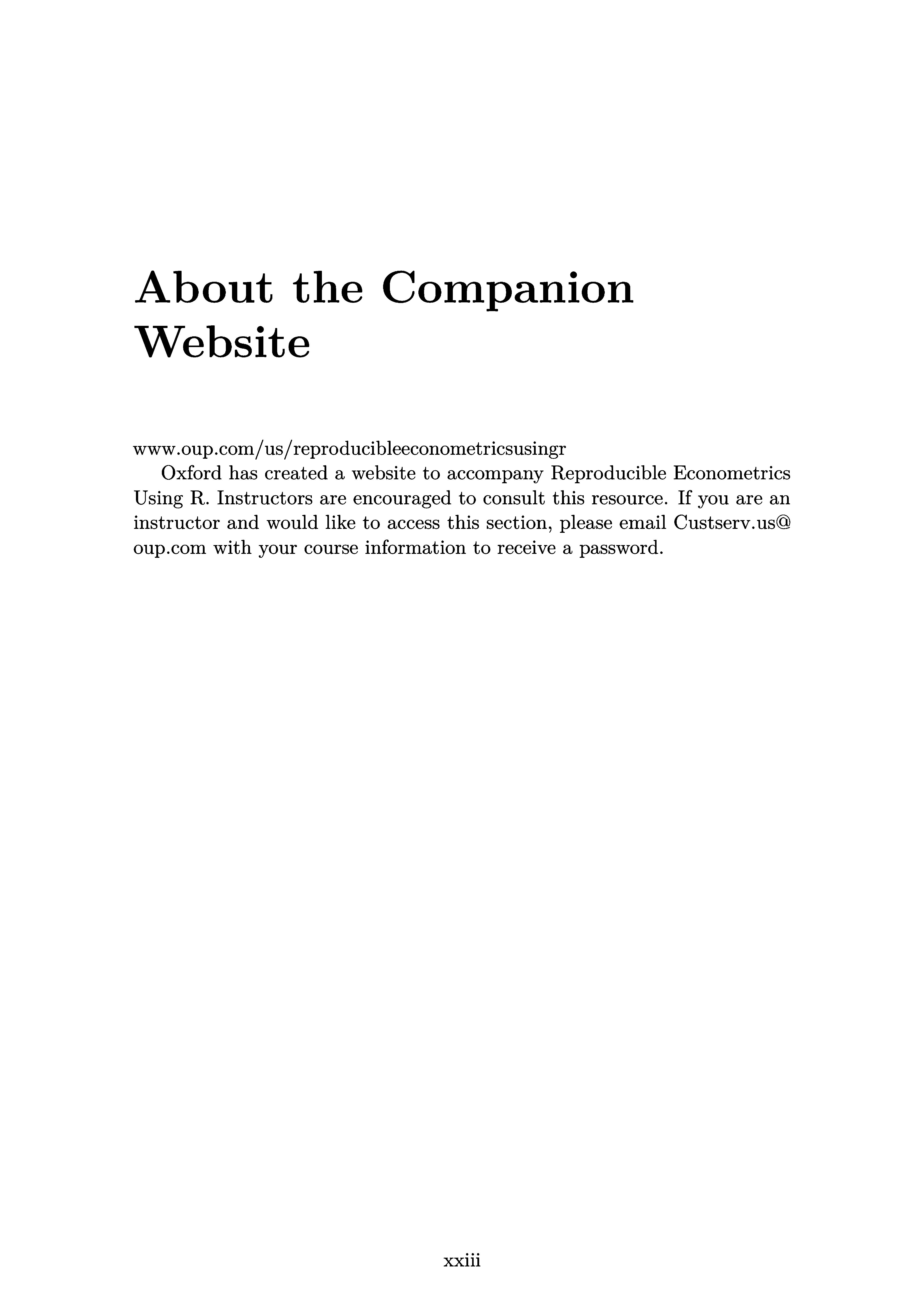 Oxford has created a website to accompany Reproducible Econometrics Using R. Instructors are encouraged to consult this resource. If you are an instructor and would like to access this section, please email Custserv.us@ oup.com with your course information to receive a password.