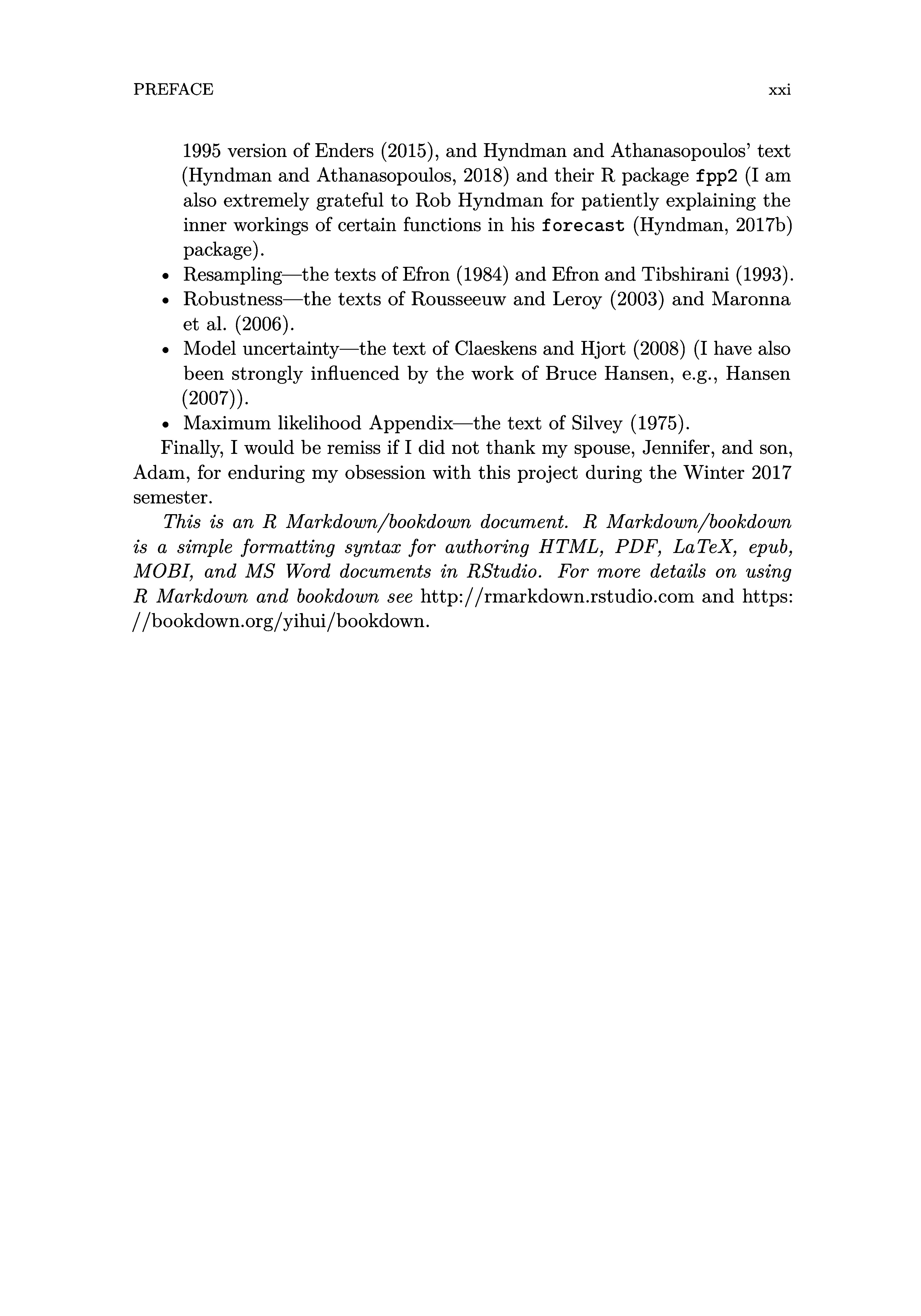 1995 version of Enders (2015), and Hyndman and Athanasopoulos’ text (Hyndman and Athanasopoulos, 2018) and their R package fpp2 (I am also extremely grateful to Rob Hyndman for patiently explaining the inner workings of certain functions in his forecast (Hyndman, 2017b) package).