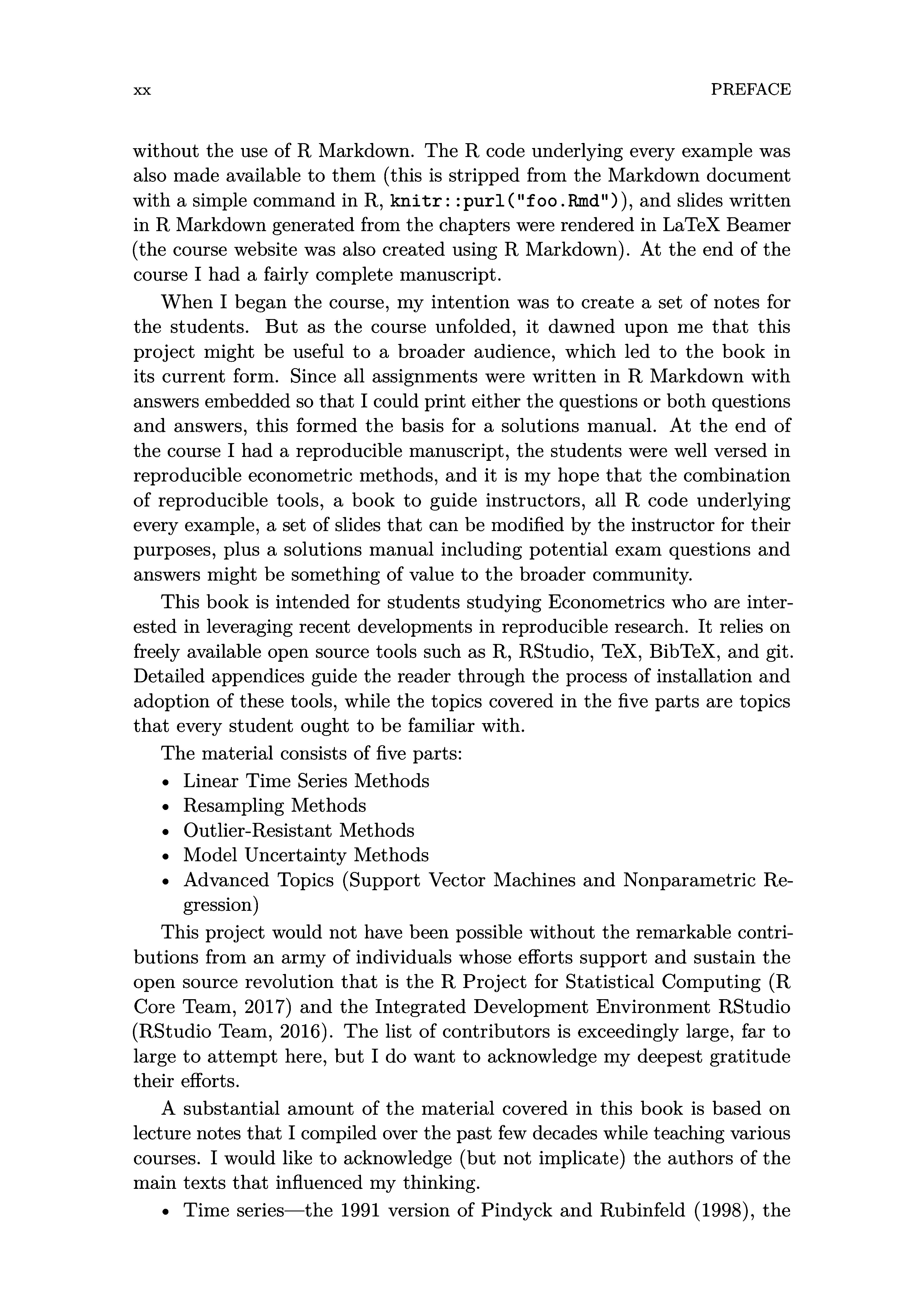 When I began the course, my intention was to create a set of notes for the students. But as the course unfolded, it dawned upon me that this project might be useful to a broader audience, which led to the book in its current form. Since all assignments were written in R Markdown with answers embedded so that I could print either the questions or both questions and answers, this formed the basis for a solutions manual. At the end of the course I had a reproducible manuscript, the students were well versed in reproducible econometric methods, and it is my hope that the combination of reproducible tools, a book to guide instructors, all R code underlying every example, a set of slides that can be modified by the instructor for their purposes, plus a solutions manual including potential exam questions and answers might be something of value to the broader community.