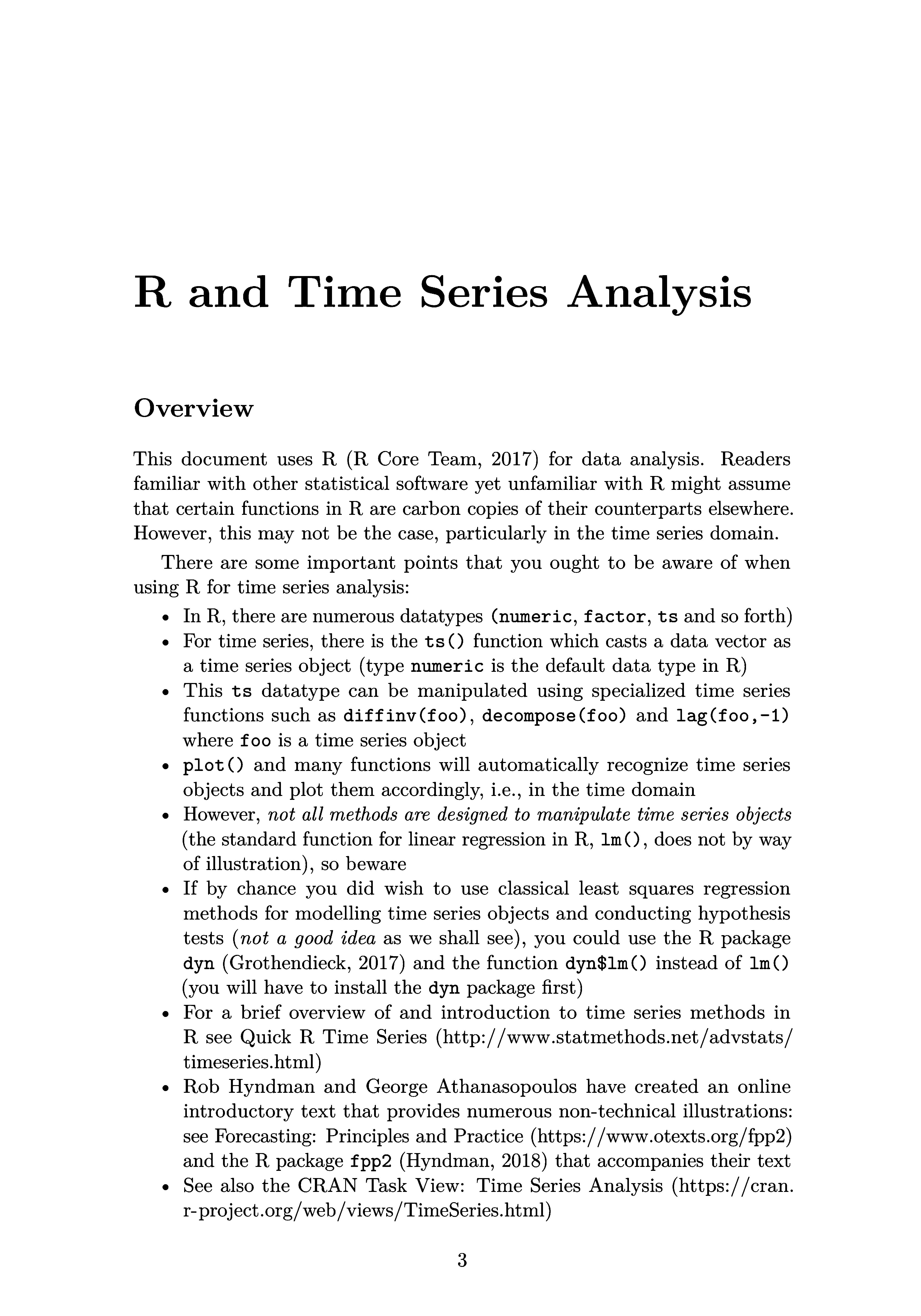 This document uses R (R Core Team, 2017) for data analysis. Readers familiar with other statistical software yet unfamiliar with R might assume that certain functions in R are carbon copies of their counterparts elsewhere. However, this may not be the case, particularly in the time series domain. There are some important points that you ought to be aware of when using R for time series analysis: