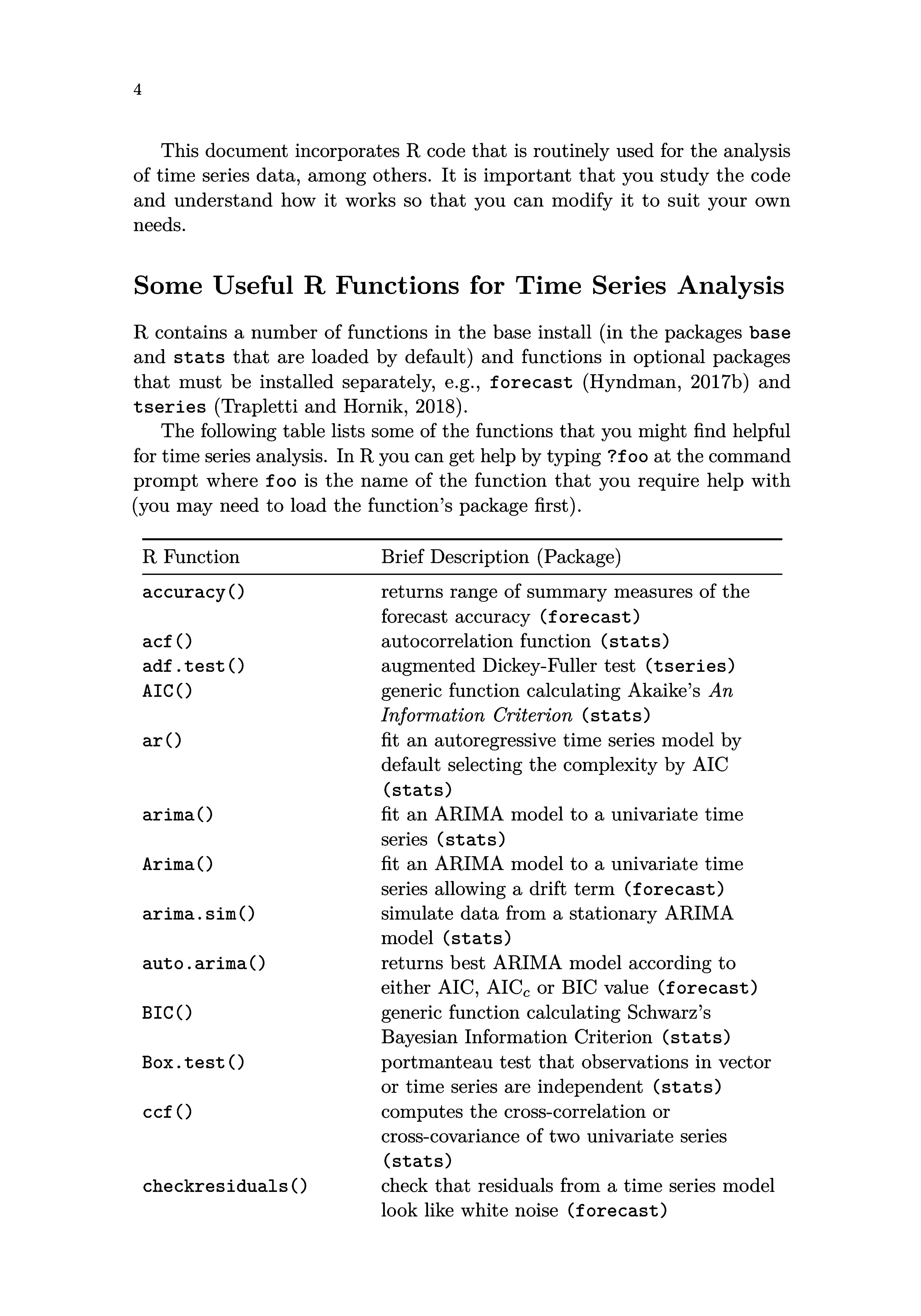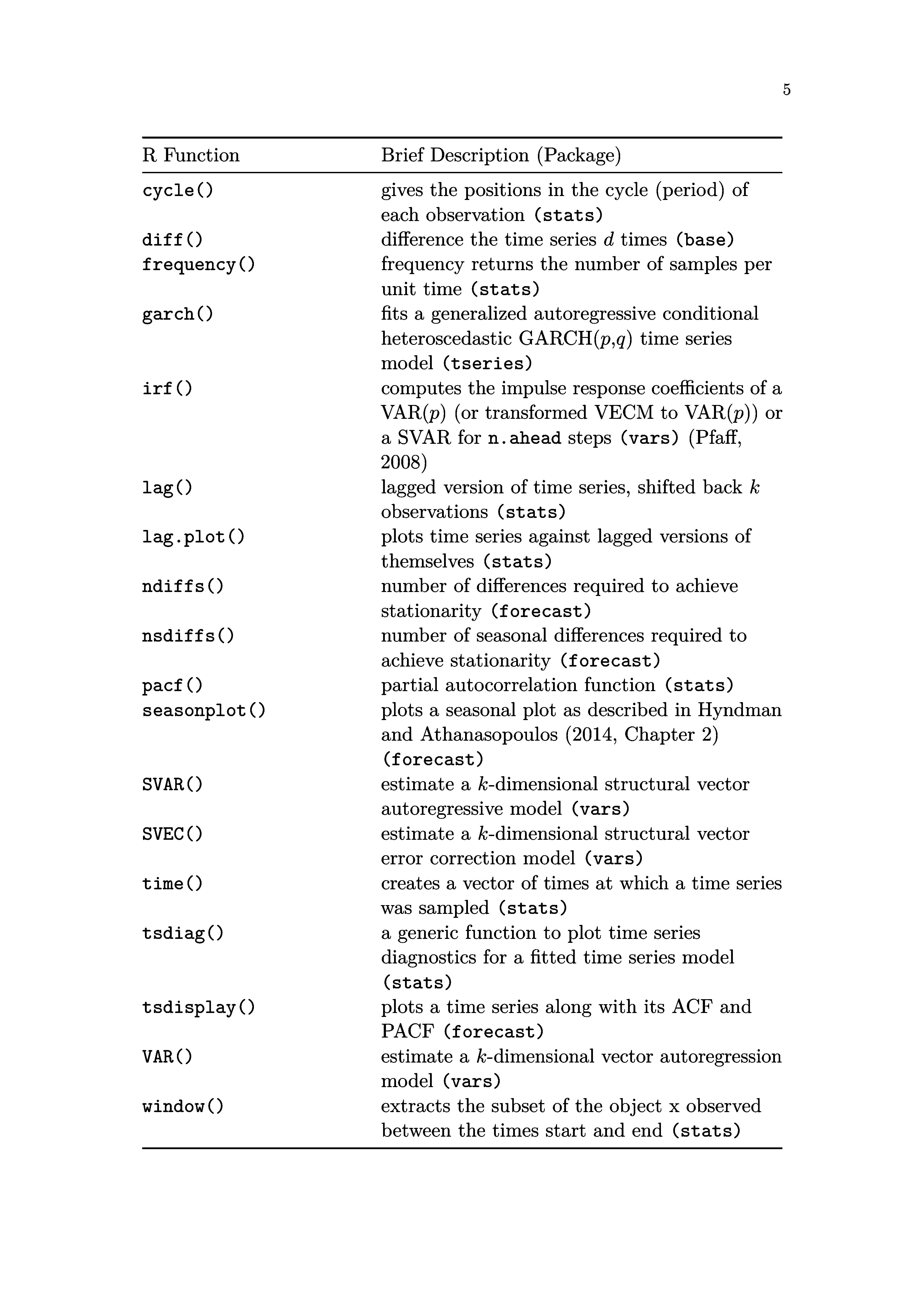 R contains a number of functions in the base install (in the packages base and stats that are loaded by default) and functions in optional packages that must be installed separately, e.g., forecast (Hyndman, 2017b) and tseries (Trapletti and Hornik, 2018).
