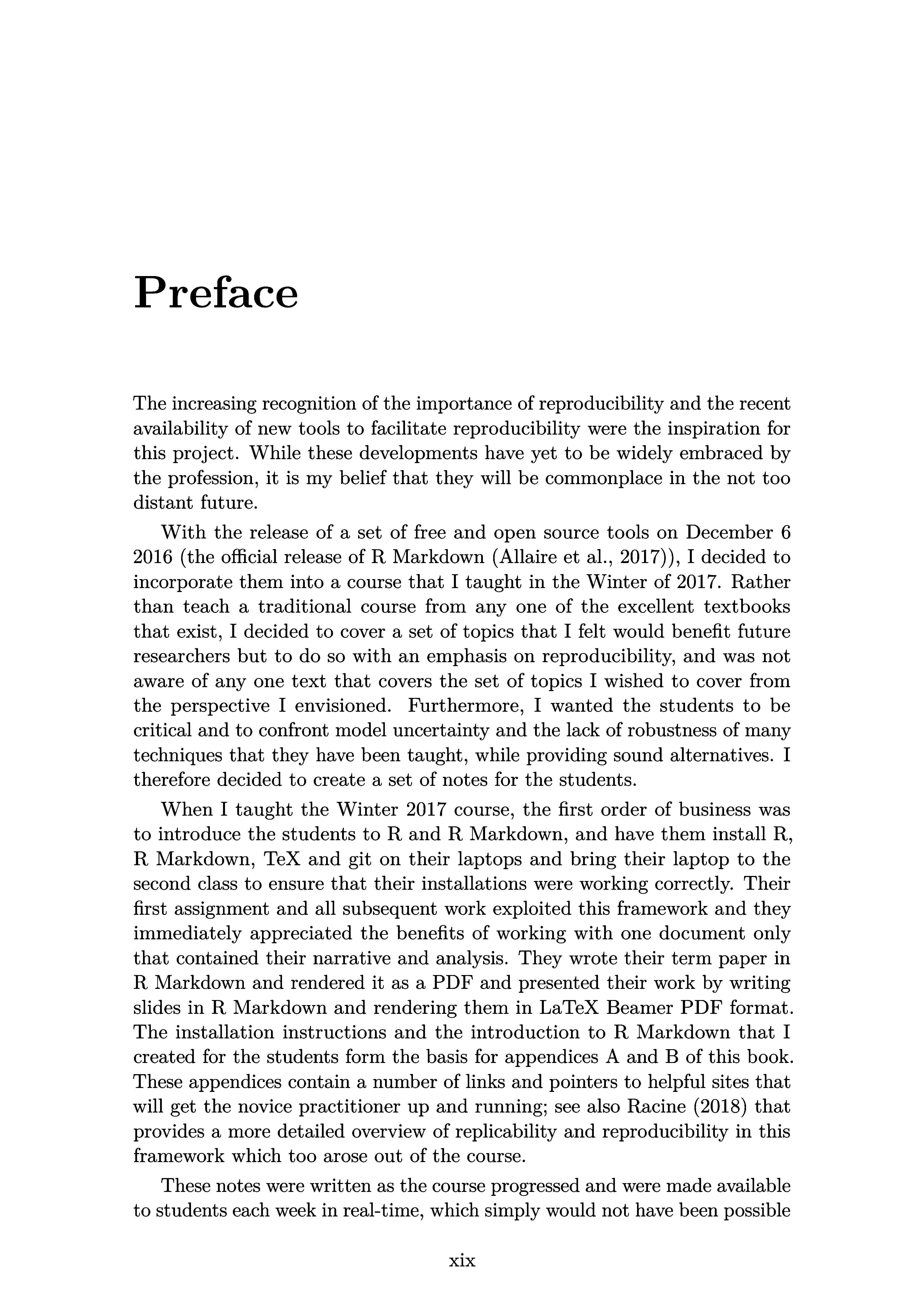 With the release of a set of free and open source tools on December 6 2016 (the official release of R Markdown (Allaire et al., 2017)), I decided to incorporate them into a course that I taught in the Winter of 2017. Rather than teach a traditional course from any one of the excellent textbooks that exist, I decided to cover a set of topics that I felt would benefit future researchers but to do so with an emphasis on reproducibility, and was not aware of any one text that covers the set of topics I wished to cover from the perspective I envisioned. Furthermore, I wanted the students to be critical and to confront model uncertainty and the lack of robustness of many techniques that they have been taught, while providing sound alternatives. I therefore decided to create a set of notes for the students.