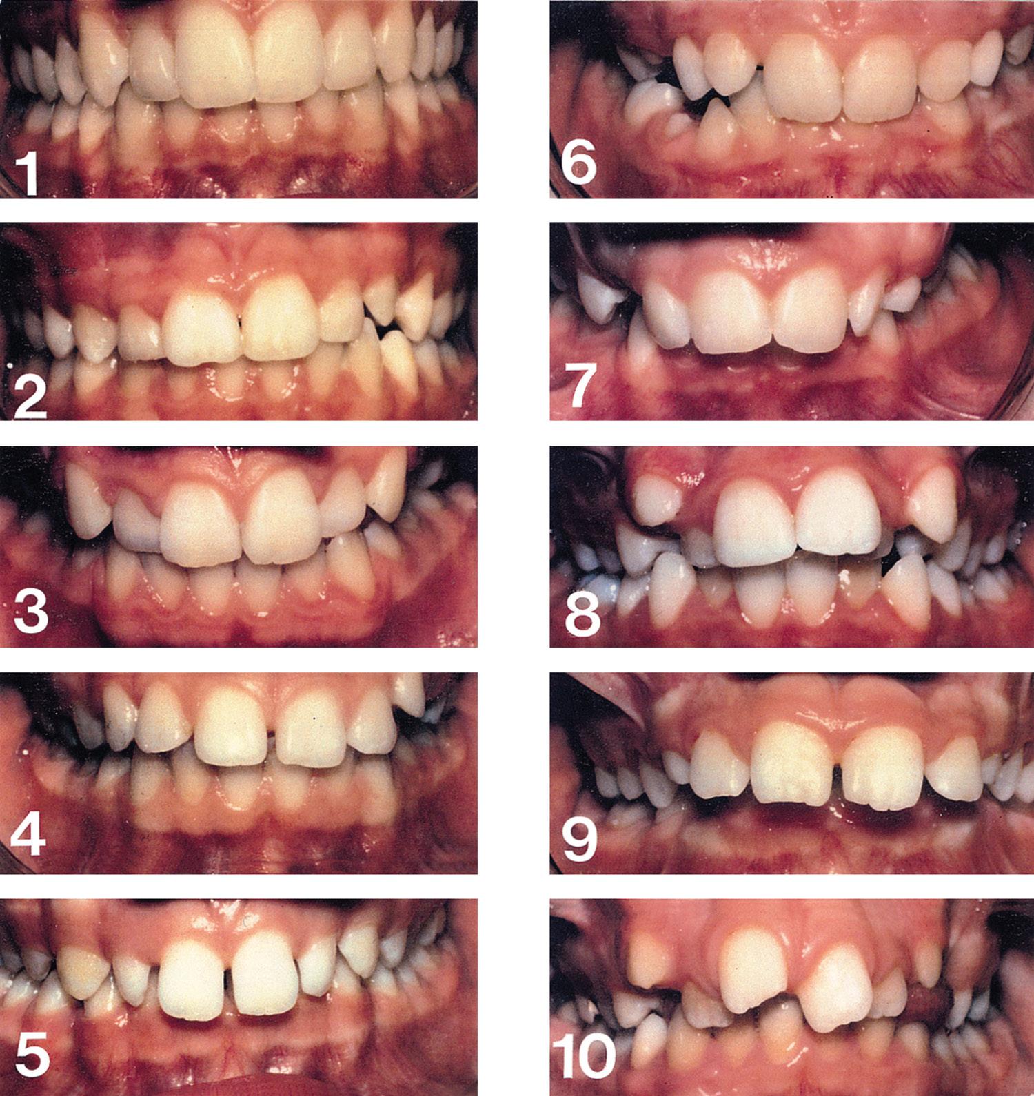 This aspect of the index was developed in an attempt to assess the aesthetic handicap posed by a malocclusion and thus the likely psychosocial impact upon the patient—a difficult task (see Chapter 1). The aesthetic component comprises a set of ten standard photographs (Fig. 2.7), which are also graded from score 1, the most aesthetically pleasing, to score 10, the least aesthetically pleasing. Colour photographs are available for assessing a patient in the clinical situation and black-andwhite photographs for scoring from study models alone. The patient’s teeth (or study models), in occlusion, are viewed from the anterior aspect and the appropriate score determined by choosing the photograph that is thought to pose an equivalent aesthetic handicap. The scores are categorized according to need for treatment as follows: