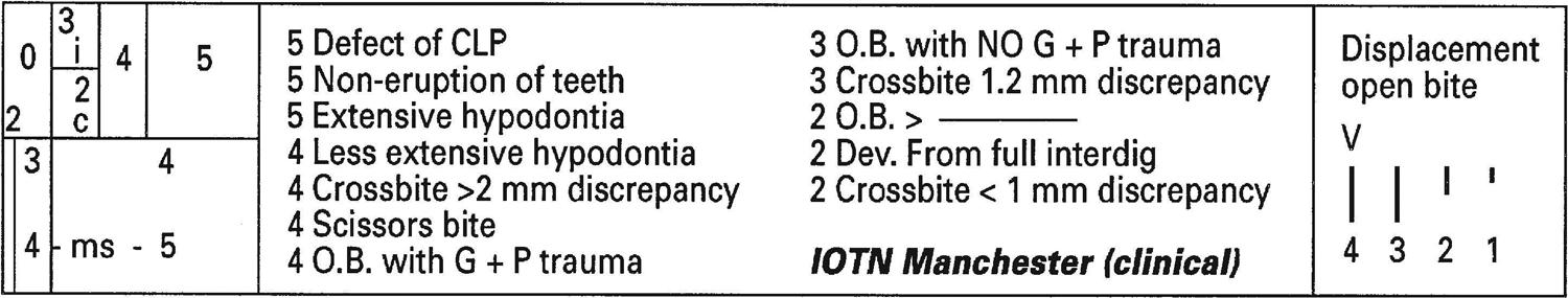 A new index was developed from the IOTN with the aim of trying to address these concerns and to reflect the functional issues that arise with these severe surgical cases. Like IOTN, it is based on a 5-point scale with Grade 5 reflecting a ‘Very Great Need to Treatment’ and Grade 1 ‘No Need for Treatment’ (see Box 2.5).