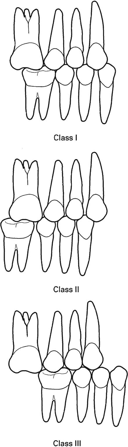 • Class III or mesiocclusion—the mesiobuccal cusp of the lower first molar occludes mesial to the Class I position. This is also known as a prenormal relationship.
