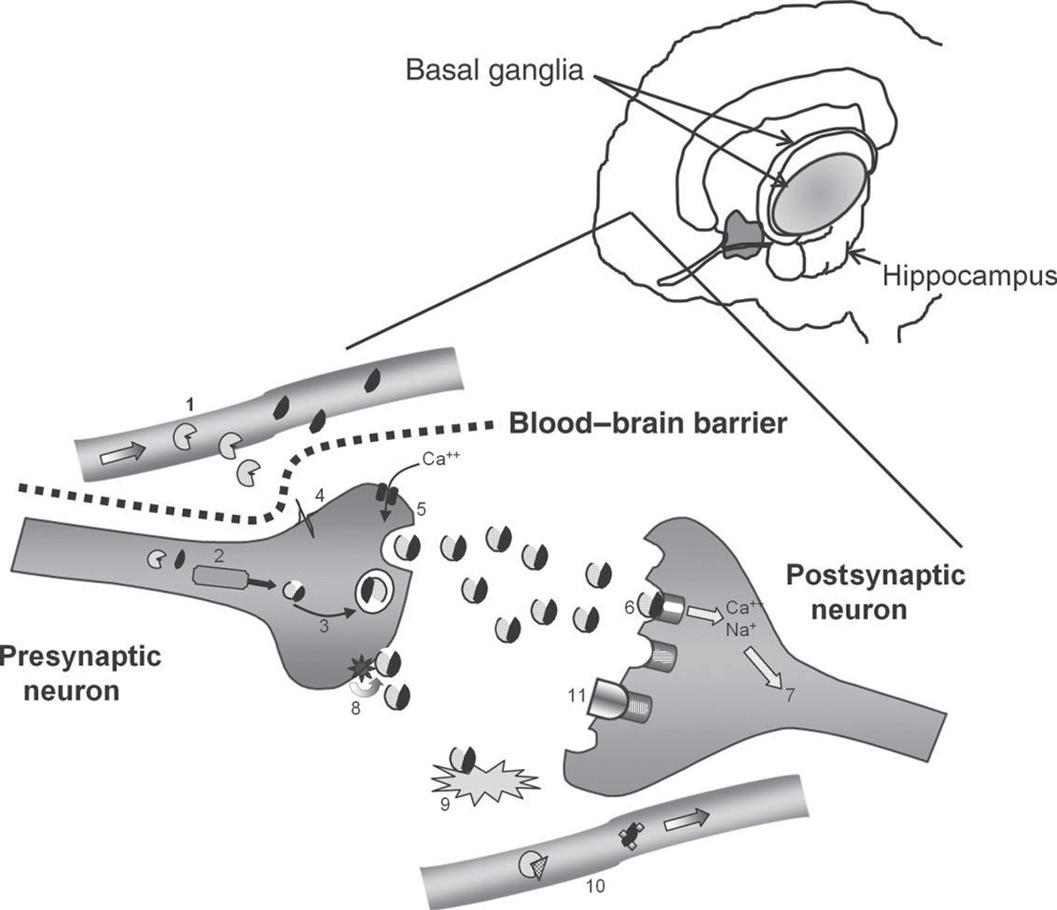 Meanwhile, after interacting with the receptor, the actions of the neurotransmitter must be terminated by means of its reabsorption (labeled 8 in Figure 1.1b) back into the neuron that originally released it. This is called reuptake. A secondary method of neurotransmitter inactivation is by local enzymes (labeled 9) into a chemical that can no longer interact with the brain. Once the neurotransmitter is enzymatically inactivated, it is removed from the brain into the bloodstream (labeled 10).