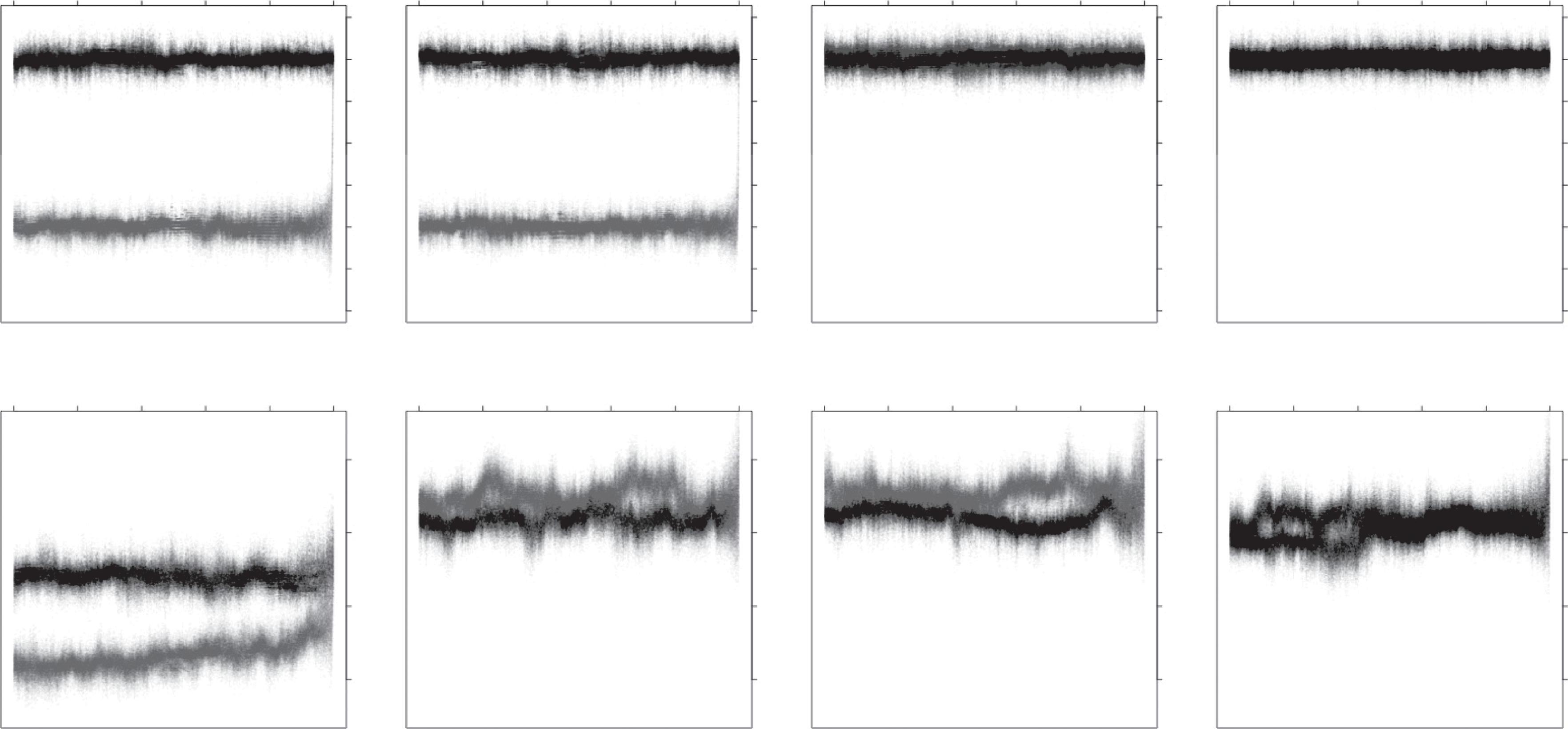 Fig. 2.3 Patterns of diversification in a reproductive (top row) and ecological (bottom row) trait in four scenarios building up diversifying mechanisms simulated using the model described in box 2.2. Density of shading indicates the frequency of individuals with that phenotype. (A) Assortative mating based on similarity of a continuous phenotypic trait in a single geographical region with uniform selection on the ecological trait. Reproductively isolated groups sometimes emerge but are short-lived and lost through ecological drift within relatively few generations. (B) Individuals are now split into two geographical regions (coloured black and grey, respectively) with no dispersal at time zero. The optimum phenotype for the ecological trait is the same in both regions (0.2), that is, under uniform selection, and so ecological trait distributions overlap. Reproductive trait values diverge slowly because of the advantage of having a reproductive trait value close to the population mean. (C) Each region now has a different optimum phenotype for the ecological trait (0.2 and 0.4, respectively), and consequently the ecological trait diverges rapidly but the reproductive trait remains relatively uniform between populations. (D) Ecological and reproductive traits are genetically correlated (50 percent of their 10 loci in common) and so now reproductive traits diverge rapidly. Total number of individuals was 1000, with 500 in each region, and simulations ran for 5000 generations. Simulation code and other parameter values are available from the website accompanying the book.