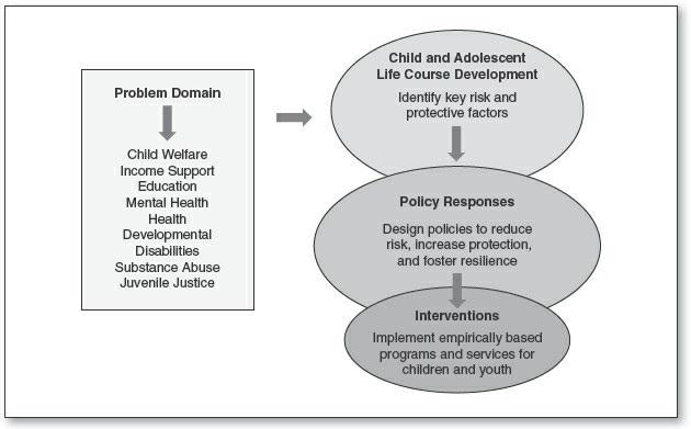 In the CTC model, communities form coalitions to engage in systematic prevention planning, which requires them to identify risk and protective factors for adolescent problems that are prevalent in their localities Following the assessment of such factors, communities are encouraged to select prevention strategies based on available empirical evidence (Brown, Hawkins, Arthur, Briney, & Fagan, 2011). Recent findings from the Community Youth Development Study, which is a longitudinal, randomized trial that uses principles of the CTC model, have revealed significantly lower rates of delinquency and drug use among students in experimental communities as compared with control communities (Hawkins et al., 2008; Hawkins et al., 2012). These groundbreaking findings suggest that well-organized and well-implemented community planning efforts that focus on risk and protection can lead to positive outcomes for young people. Although the CTC model falls short of satisfying the criteria for a formal policy, it successfully initiates a process whereby knowledge of risk and protective factors becomes an integral part of program design. As implied in the preceding examples, applying principles of risk and resilience to policy design requires an understanding of the developmental trajectories associated with the onset or persistence of child and adolescent problems. Figure 1.1 illustrates the process involved in applying a public health perspective to policy and program design for children, youth, and families