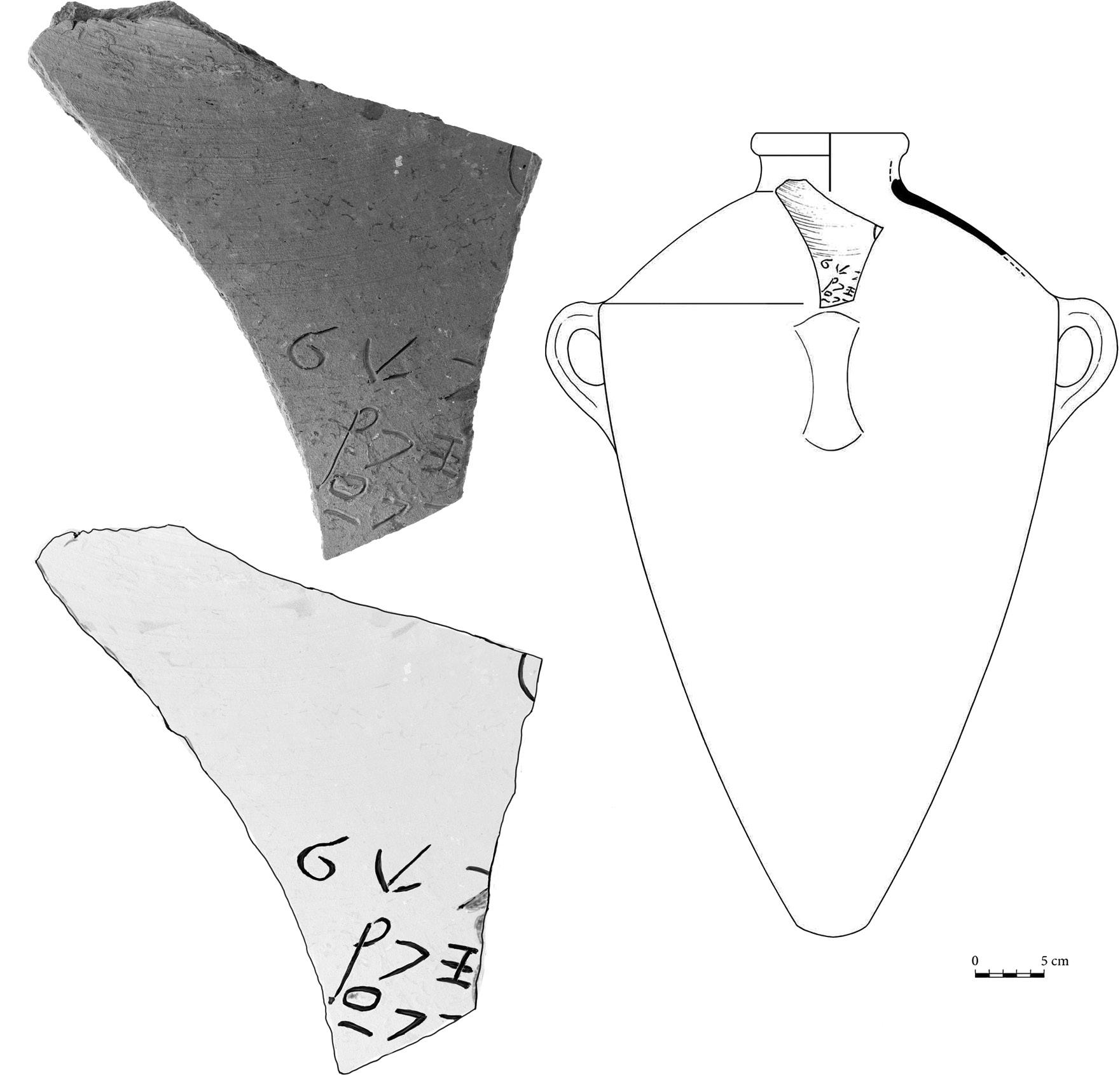 Figure 1.1 Lachish jar inscription with the title “Scribe.” Courtesy of The Fourth Expedition to Lachish; photo by Tal Rogovsky; jar drawing by O. Dobovsky; inscription drawing by the author.