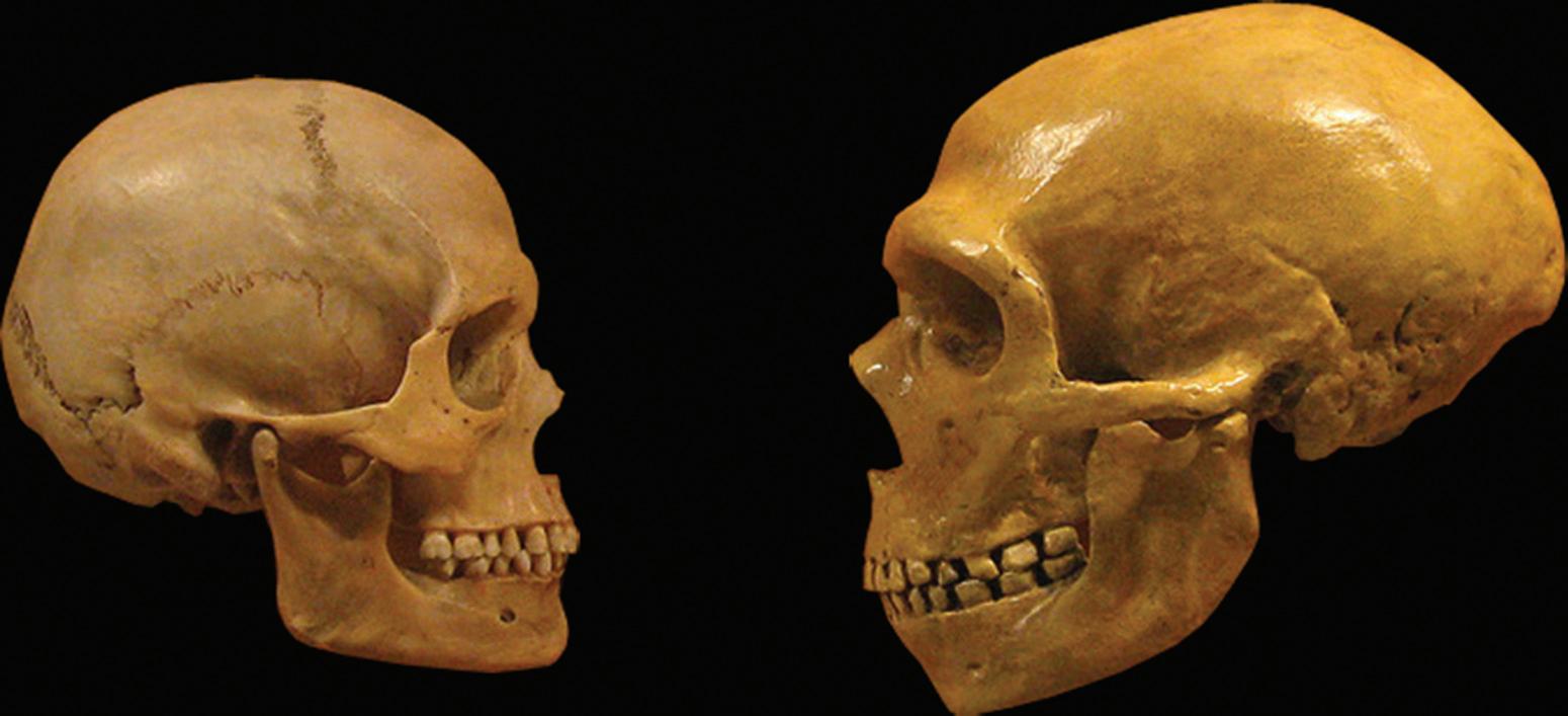 (left).WhencomparedtoolderancestorssuchasNeanderthal (right),itislightlybuiltwithahighforeheadandaprominentchin,featureswhichanatomists sinceHuxleyhaveheldasimportantmarkersofourevolutionarystatus.