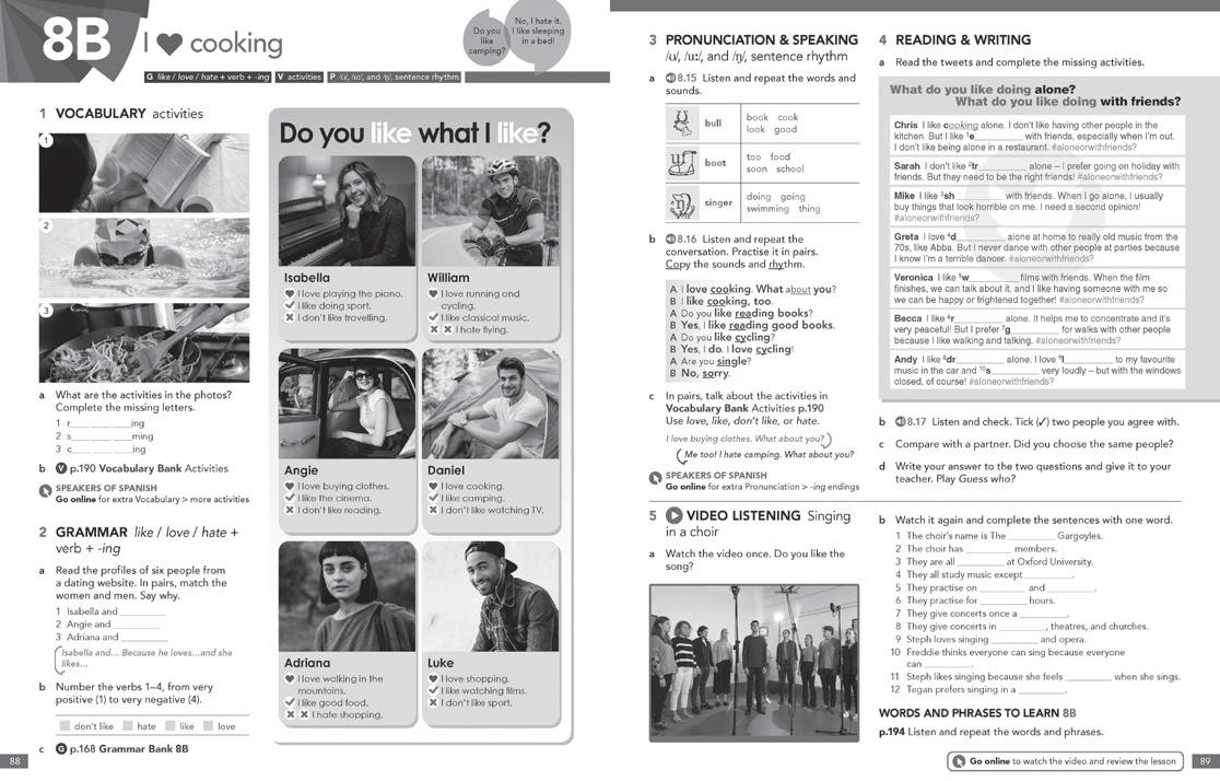 We have tried to provide contexts for new language that will engage students, using real-life stories and situations, humour, and suspense. The Grammar Banks give students a single, easy-to-access grammar reference section, with example sentences with audio, clear rules, and common errors. There are at least two practice exercises for each grammar point. Students can look again at the grammar presented in the lesson on Online Practice. The Workbook provides a variety of practice exercises and the opportunity for students to use the new grammar to express their own ideas.