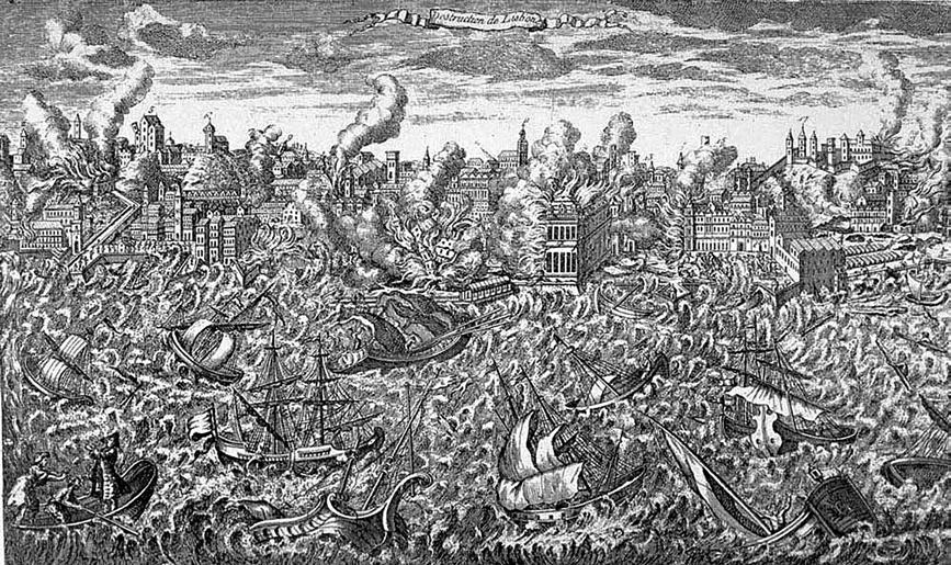 Especially when experiencing natural phenomena, the common belief was that things were directed by an unpredictable god and that anticipating them ahead of time was impossible. One natural event in particular was widely viewed as both the literal and the symbolic manifestation of this view: the Great Lisbon Earthquake of 1755. The full tragedy was actually composed of three related disasters: the earthquake itself; a devastating tsunami, which followed forty minutes later; and then a number of small fires that merged into a horrifying, citywide firestorm which lasted for weeks. All told, perhaps as many as 100,000 souls lost their lives in the catastrophe—about half the population of the city and its environs.