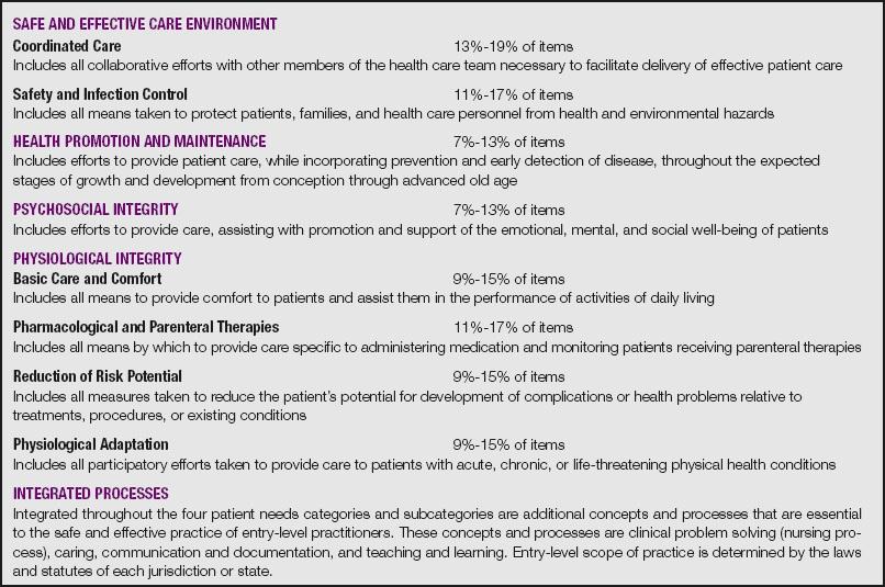 The National Council’s test plan for the NCLEX-PN examination consists of one essential content dimension or framework: client need. This framework provides a structure that is universal in defining the actions and competencies necessary to provide safe and effective nursing care to patients in various health care settings. Therefore the dimension of client need is critical to ensure the overall intent of the examination: to protect the public through safe practitioners. A more detailed description of the 2011 NCLEX-PN Test Plan and the distribution of content for the examination are provided in Box 1-1.