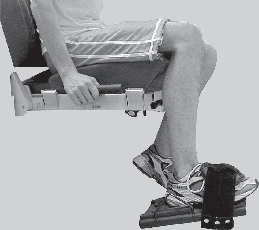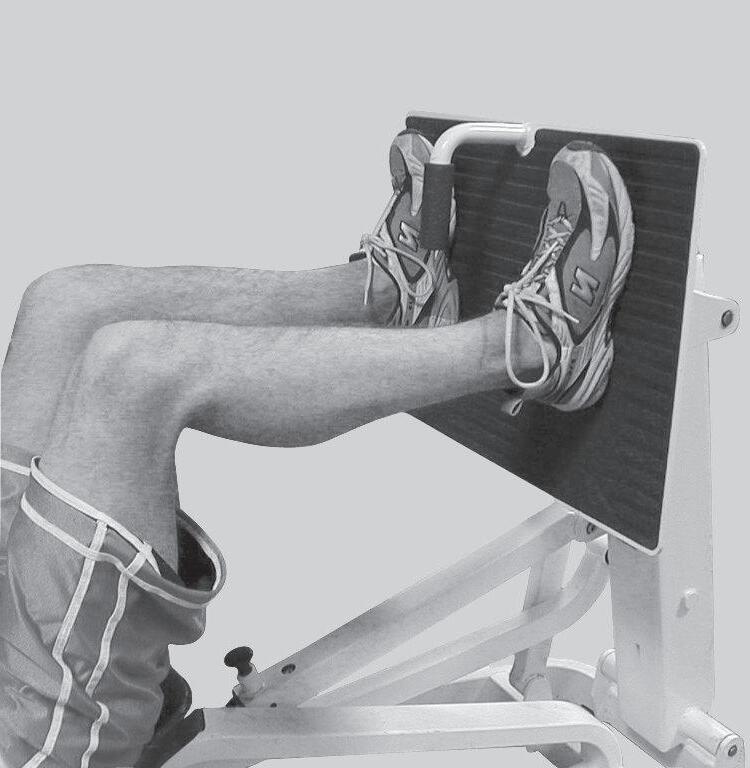 John Alexander is 20 years old, is 5 feet 9 inches (1.75 m) in height, and weighs 165 pounds (~75 kg or 734 N). John is a member of the university’s lacrosse team. He sustained an injury when another player fell onto the posterior-lateral aspect of his right knee. Physical examination and magnetic resonance imaging (MRI) resulted in a diagnosis of a tear of the medial collateral ligament, a partial tear of the anterior cruciate ligament (ACL), and a partial tear of the medial meniscus. John agreed with the orthopedist’s recommendation that a program of knee muscle strengthening was in order before moving to more aggressive options. The initial focus will be on strengthening the quadriceps muscle. The fitness center at the university has a leg-press machine (Fig. 1–1A) and a free weight boot (see Fig. 1–1B) that John can use.
