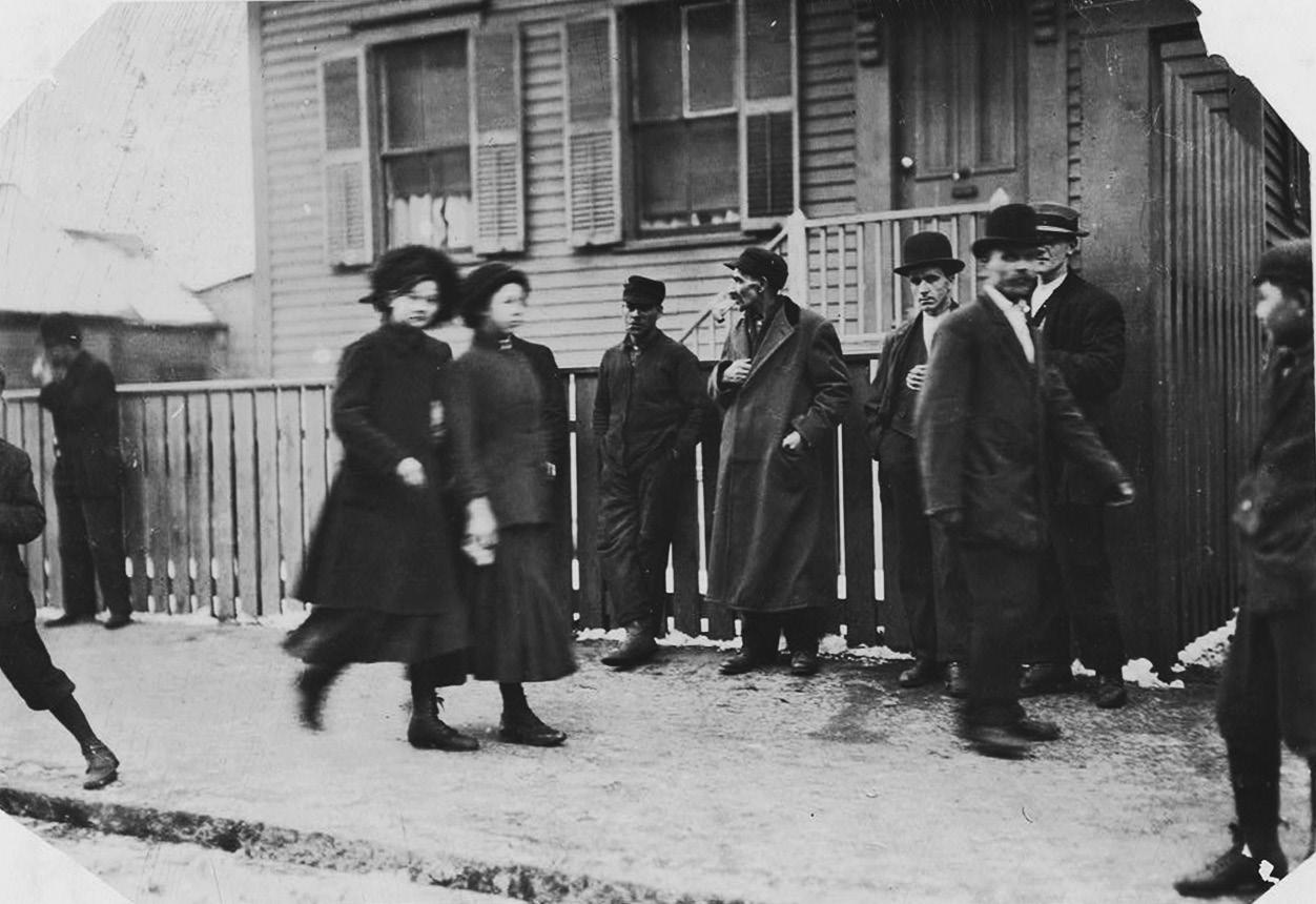 Illustration 1.1 Young girls running the gauntlet of men making remarks (sometimes vile). Location: New Bedford, Massachusetts—1912. Source: Library of Congress.