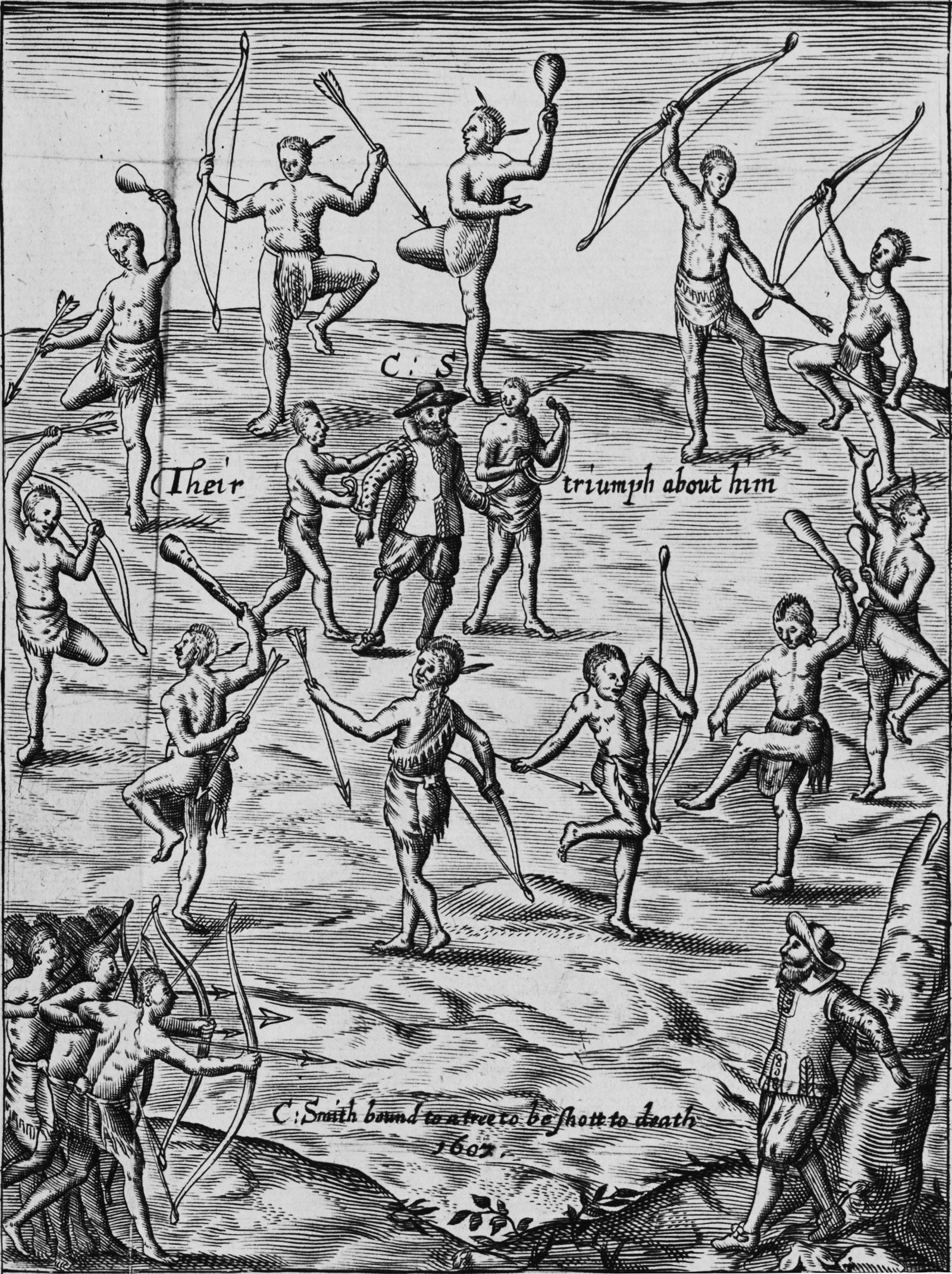 Visual renderings had the power to shape Europeans’ imaginations about the New World’s inhabitants, but they were susceptible to mistranslation and adaptation. The English artist John White had sustained contact with the Secotan Indians during his two-year stay in what would become North Carolina and tried to document them faithfully in “A Festive Dance” (ca. 1585, left). However, when his representation of a peaceful Indian feast arrived in England, it was reimagined by the English engraver Robert Vaughan as a warlike procession around the captured John Smith in his illustration “Their Triumph about Him” for Smith’s The Generall Historie of Virginia, New-England, and the Summer Isles (1627, right). Library of Congress, F229.S59 1907; British Museum, 1906, 0509.1.10
