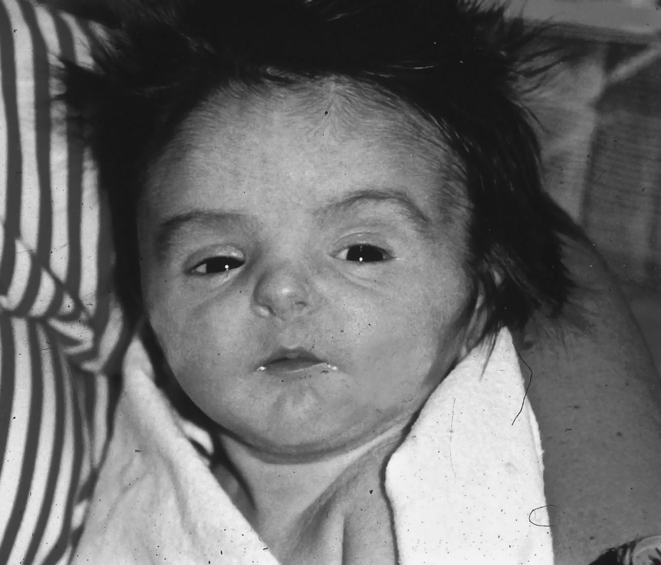 FIGURE 2.5 Meier–Gorlin syndrome. Note sparse scalp hair and eyebrows, and full lips. Ears were also very small.