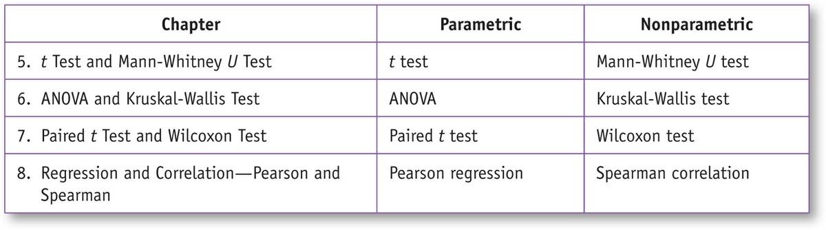 ParametricVersusNonparametric(Pronouncedpair-uh-metric) Inthepriortable(“OverviewofStatisticalFunctions”),youmayhavenoticedthatChapters5through8each containtwostatisticaltests