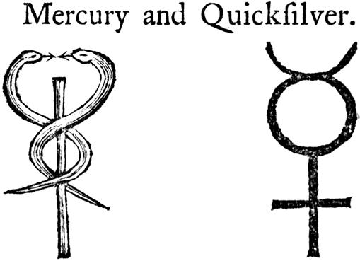 Fig. 9. The alchemical symbol (right) for both the planet and metal is the wand or caduceus of the god Mercury.
