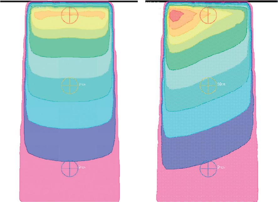 Fig. 2.14 Radiation distribution for a parallel opposite 6 MV beam for patient separations of 12 cm, 18 cm, and 24 cm, and for a parallel-opposed 15 MV beam for a patient separation of 24 cm. for the higher-energy beam the depth of the high-dose areas are more interior.