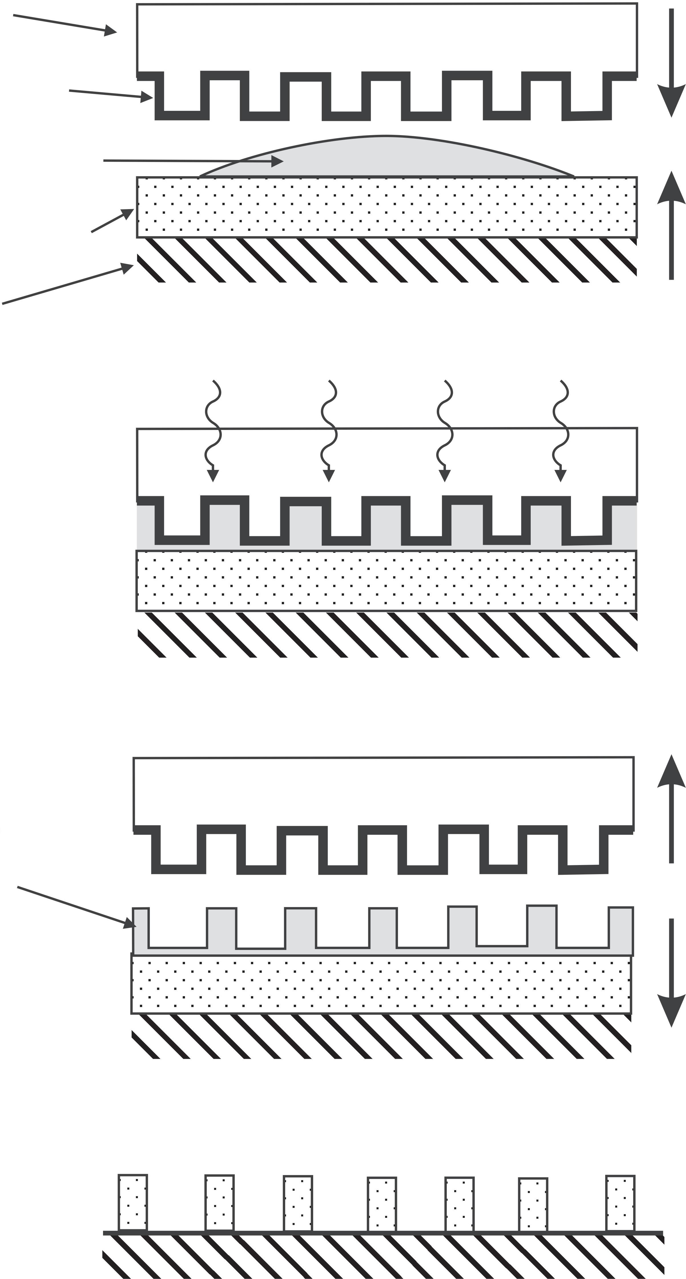 Drivenbythedifficultiesandhightoolingcostsofextendingphotolithographytechniquestotheproductionofsub-100nmfeatures,atremendousresearcheffortis beingexpendedondevelopingalternativestophotolithographyforfabricatingnanoscale structures. Nanoimprinting isapromisingnewtechnologyforreplicatingfeaturesas smallas <10nminsizeand,duetoitslowcostandsimplicity,shouldbeanattractive alternativetonotonlyphotolithography,butalsotoe-beamlithographyandextreme UVlithography(EUVL)(Chouetal.1996,McClellandetal.2005,Schift2008,Traub etal.2016).