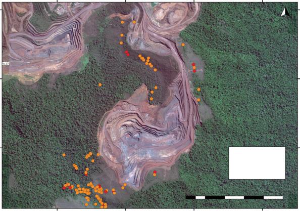 mine (N5, Serra Norte, Carajás, Brazil) showing the location of caves coloured by their classi cation. Caves with maximum relevance have at least one rare troglobiont; caves with high relevance have at least one troglobiont. From Jaffé et al. (2018). See page 215 in text.