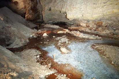 Plate 5 Main trunk passage in Lower Kane Cave, Wyoming, USA. White, lamentous microbial mats dominated by sulfur-oxidizing bacteria are present in shallow sul dic water, beginning at the lower right corner (water ows from the lower right to upper left). The microbial mat extends for approximately 20 m with an average thickness of 5 cm. From Engel (2012). Photo by A.S. Engel, with permission. See page 26 in text.