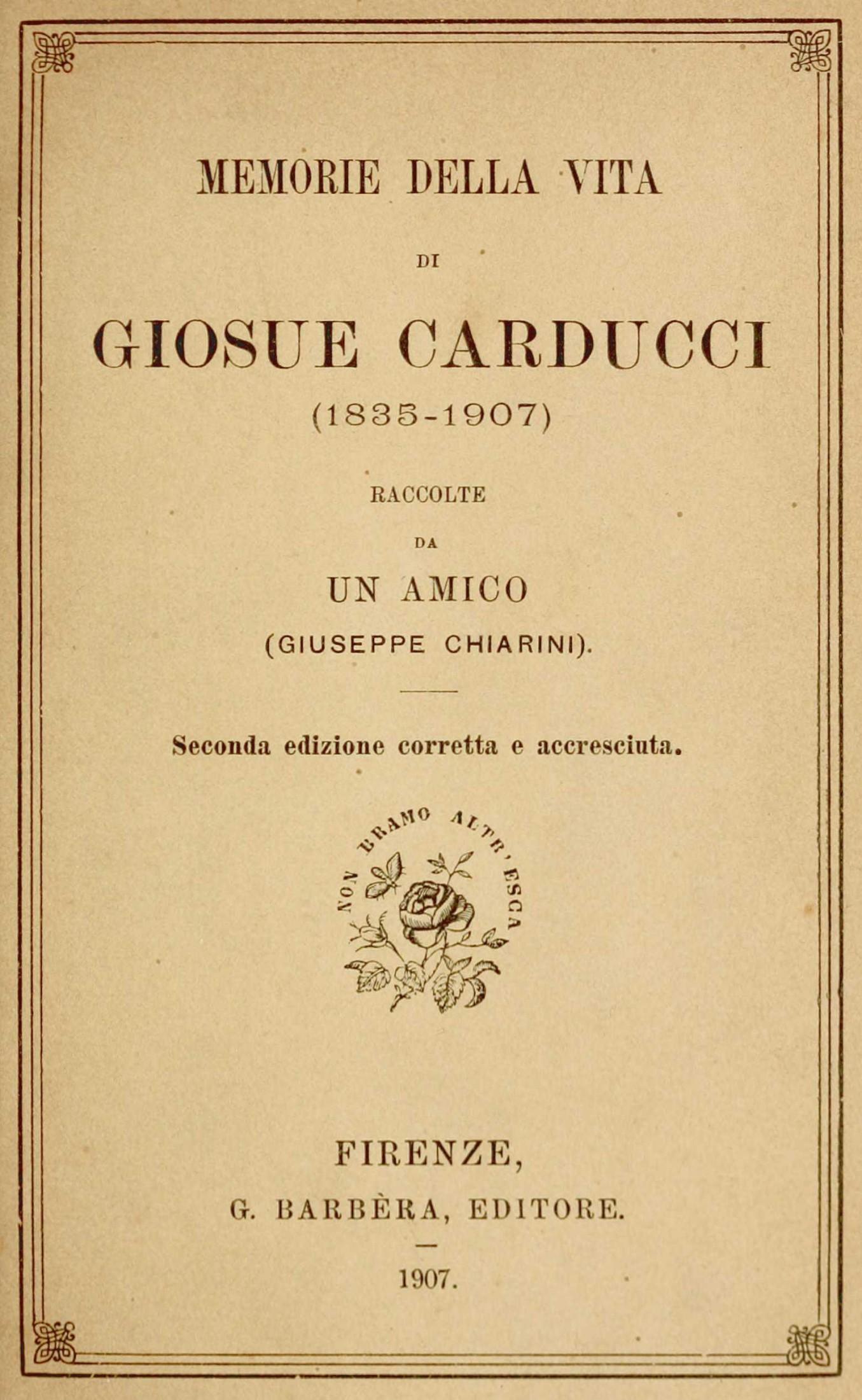 «L’adolescenza e la prima gioventù del Carducci sono state veramente spartane: quelli anni così ridenti per tutti, furon per lui anni di sacrifizj, di perseveranza, di lavoro ostinato, di dignitosi silenzi, di nobili e alteri rifiuti. E conosco una povera casa in Firenze, in fondo di via Romana, che fu testimone di giornaliere ignote lotte, — consolate solo dalle pure gioje della poetica ispirazione, da entusiasmi di ammirazioni artistiche, dalla lettura di qualche libro prestato — povera casa dove il Carducci ha scritto i primi suoi versi, le Odi oraziane, — e che a me ha insegnato più e meglio di tutti i palazzi Strozzi e Farnese, che cosa sono le realtà e le idealità della vita.