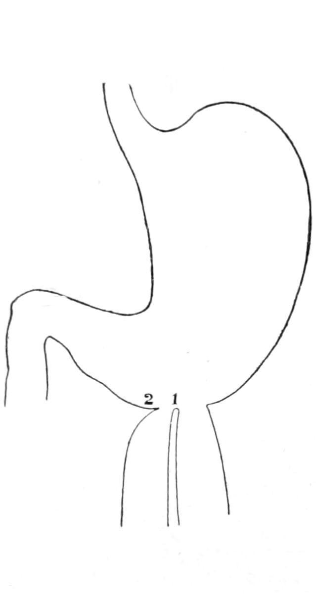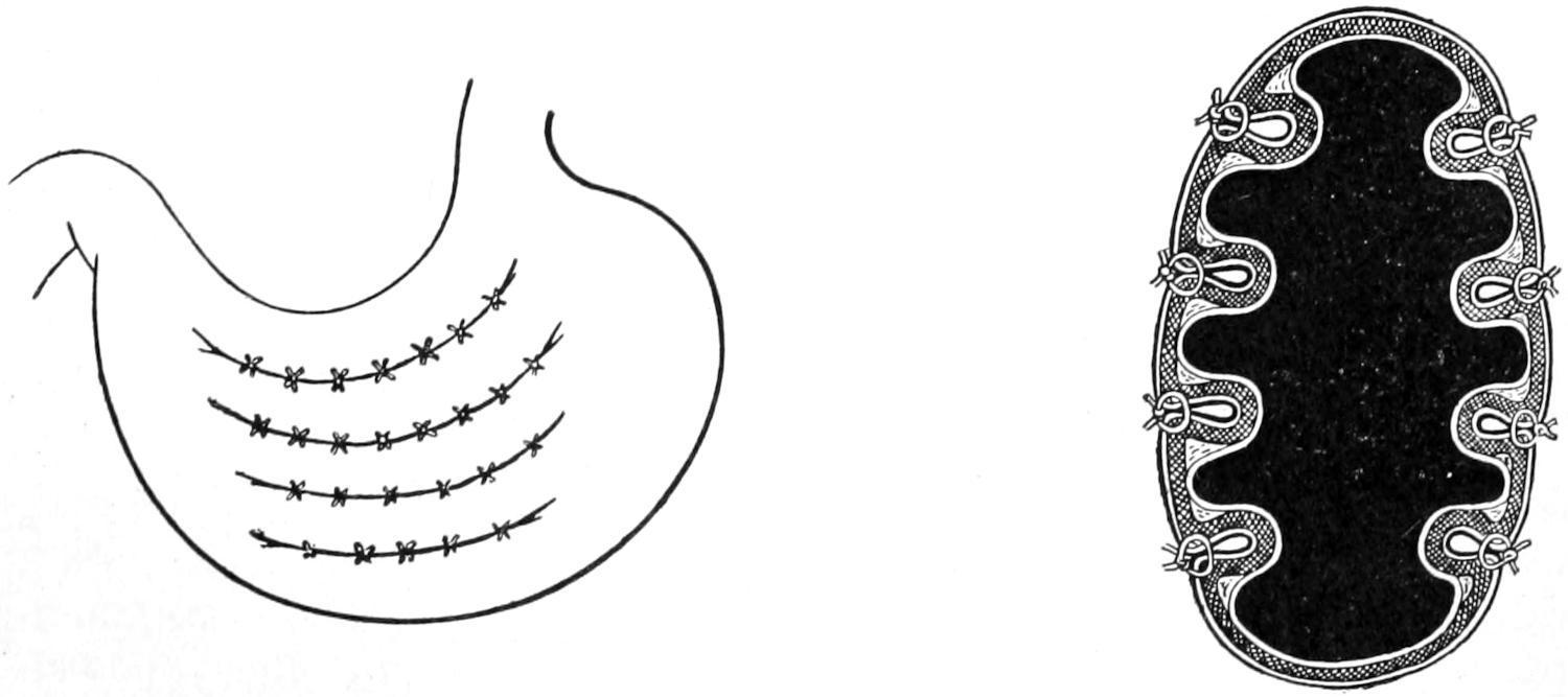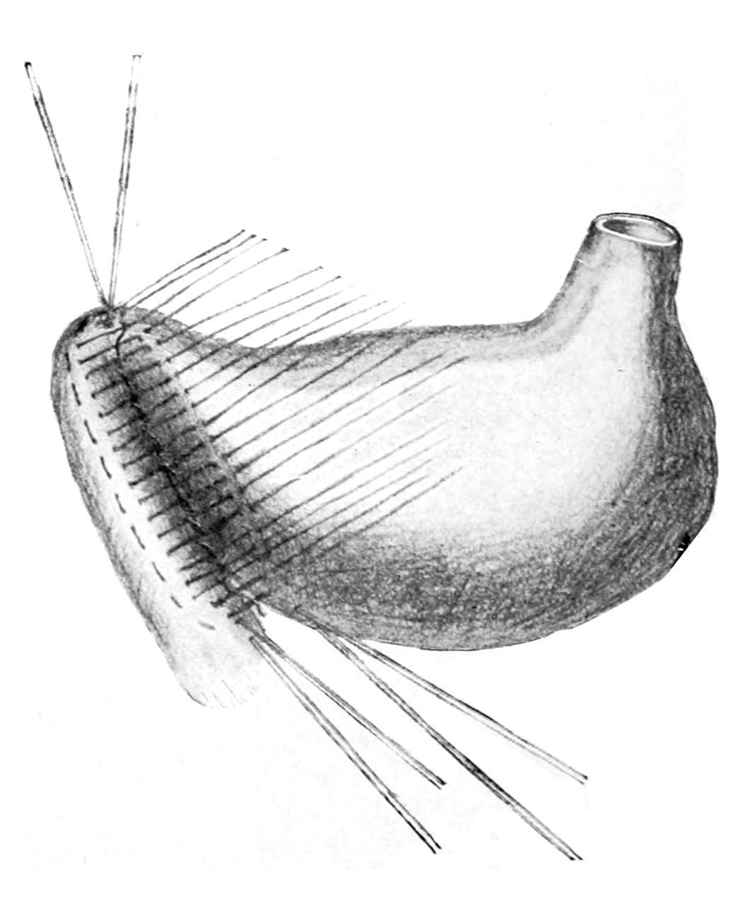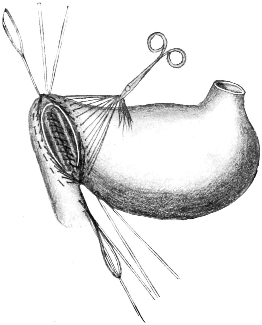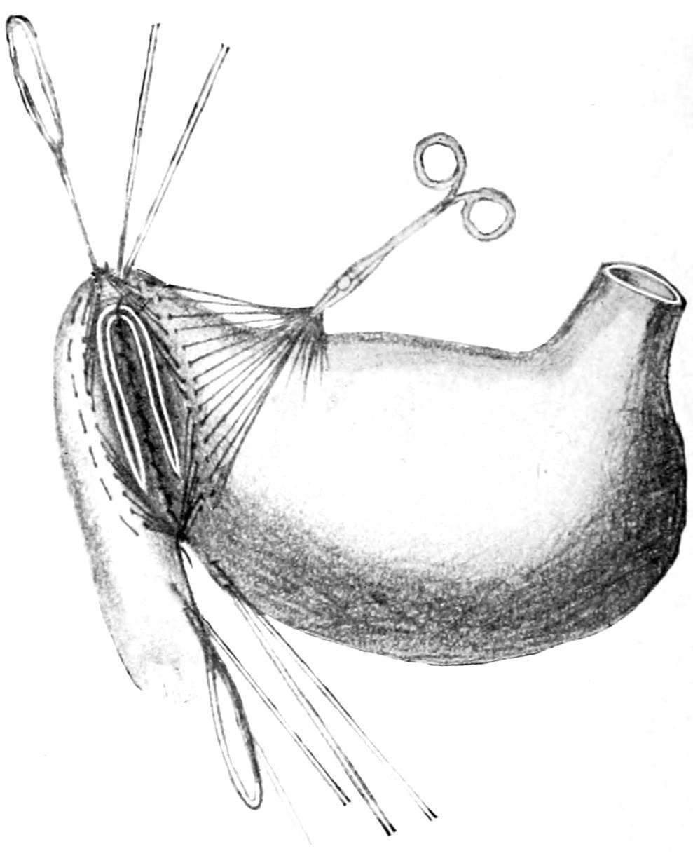 finally passed into its cavity through the smallest opening that may suffice for the purpose, after which the outer layer of the stomach is completely closed over it. The stomach itself is stitched to the deep margins of the external wound, and these are then closed without drainage. If everything has been neatly done feeding may be begun within a few hours. Care should be exercised about passing into a stomach which has long been without much food a quantity which may disturb it, or of a quality which may distress it. A procedure very much like Witzel’s is that described by Marwedel, who first sews the stomach to the abdominal wound after drawing it partly into the wound, in order to afford sufficient working material, and then infolds the tube and inserts its lower end through a small opening. This is perhaps preferable, since the stomach being so fastened up at once there is no possibility of leakage into the abdomen.