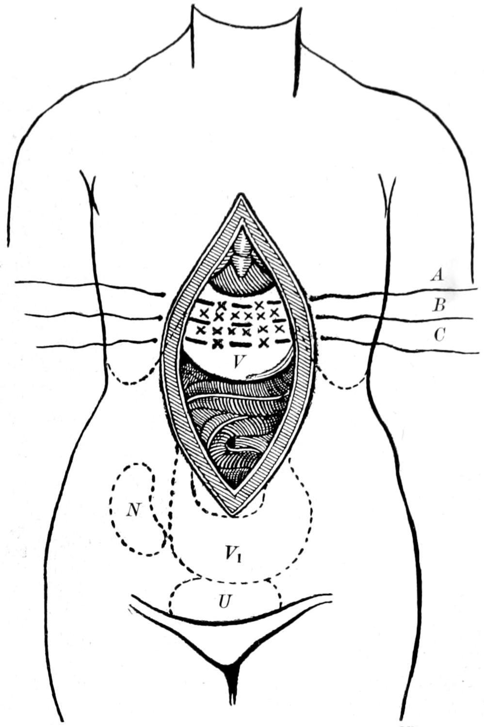 Rovsing’s operation for gastroptosis: V, stomach; V₁, position of the stomach before operation; U, urinary bladder; N, right kidney; A, B, C, silk sutures; x, x, scarifications. (Bergmann.)