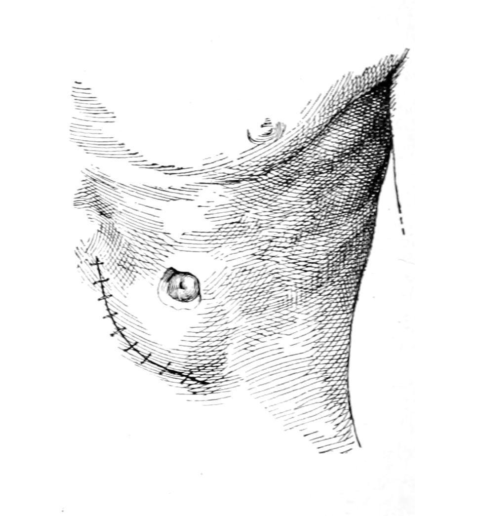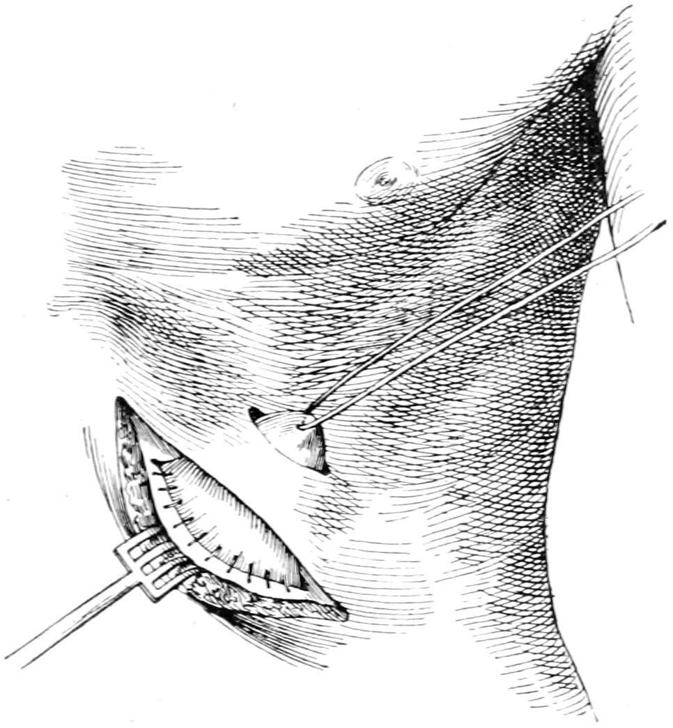 Figs. 531, 532 and 533 illustrate Frank’s method, where the stomach is pulled up through a sufficiently long incision and drawn out into a cone, whose apex is then brought out through a second small incision, parallel to the first and at a distance of an inch or so from it. Here an actual opening is made into the stomach, while the cone is fastened to the skin here and to the peritoneum through the other opening, which is then completely closed. This method cannot be applied to a contracted stomach.
