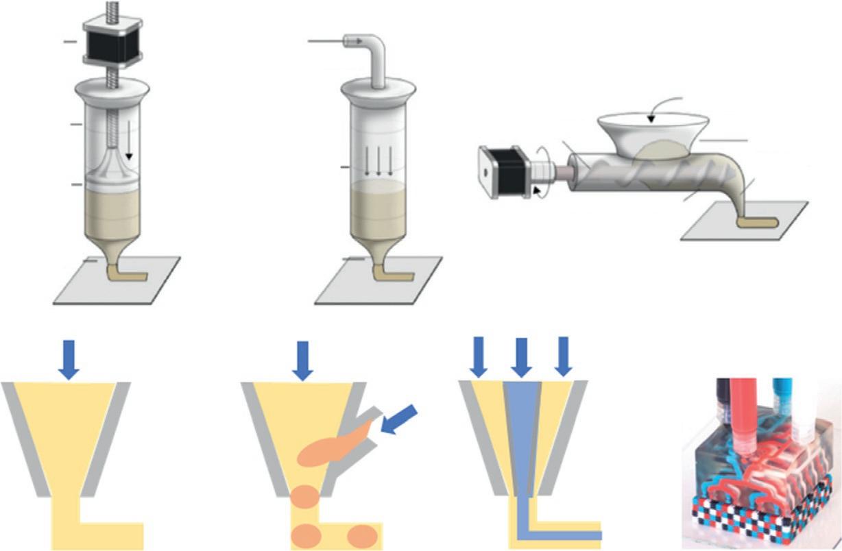 Fig.2 Extrusion3Dprintingsystem(A)threeextrusionmechanisms:piston-,pneumatic-, orscrew-drivensystems(fromlefttoright)(Sunetal.,2018);(B)schematicdrawingsof variousnozzleconfigurationdesigns:singlenozzle,nozzlewithside-inlet(modifiedfrom Schutyseretal.,2018),coaxial-nozzle(modifiedfrom Vancauwenberghe,Verboven, Lammertyn,andNicolaï,2018),complexnozzlefor(non-food)multi-materials(SkylarScott,Mueller,Visser,&Lewis,2019)(fromlefttoright),bluearrowsindicatetheflowdirectionofmaterial.