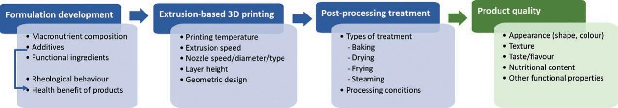 design,whichcouldbecausedbyimperfectionsduringprintingsuchaslackof continuousstructureandlossoflayerdifferentiation(e.g.collapsingofthe structure)(Pulatsuetal.,2020).Inaddition,post-printingheattreatment (e.g.baking)isoftenrequiredtoobtainediblecereal-basedfoods.Heating, however,canoftenresultinaloweringofviscosityandhenceinduceflow ofthematerial,whichmeansthattheproductlosesits3Dshapeduring post-processing(Liu,Zhang,Bhandari,&Wang,2017).Additionally,expansionofthe3Dstructuremayoccurduringbakingduetothepresenceof leaveningagentintheprintingmaterial.Suchexpansionmayresultinasignificationdeformationofthecarefullydepositeddesign,possiblyleadingtoa failedprintedresultsafterbaking.Thisisespeciallyproblematicwhenaiming forasophisticatedgeometricaldesignwithadetailedinfillpatternoraspecific poreorvoidpercentage.Therefore,whenoptimizingtheproductionprocess of3D-printedbakeryfoods,oneneedstoconsidertheeffectsofformulation design,printingsettings,andtheconditionsusedduringpost-printingtreatmentonthepropertiesandqualityofthefinalproducts(see Fig.1).Somekey factorsthatinfluencetheperformanceofeachstageduringprintingareselectivelylisted.Thosefactorsneedtobewellcontrolledinordertoachievea successfullyprintedproductswithhighquality,whichwillbeelaboratedmore laterinthissection.