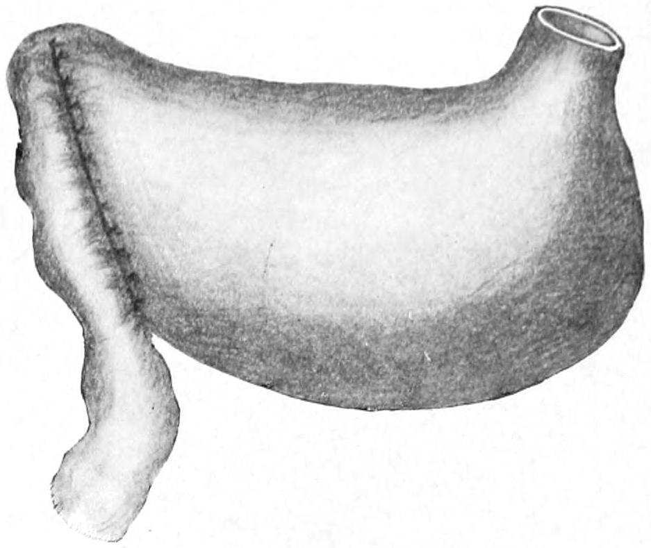 In performing complete gastrectomy the cardiac end of the stomach is brought down and fitted to the upper end of the divided duodenum, after removal of the stomach, which will usually be possible under favorable circumstances, but which exposes the patient to great risks of tearing apart reunited surfaces by undue tension.