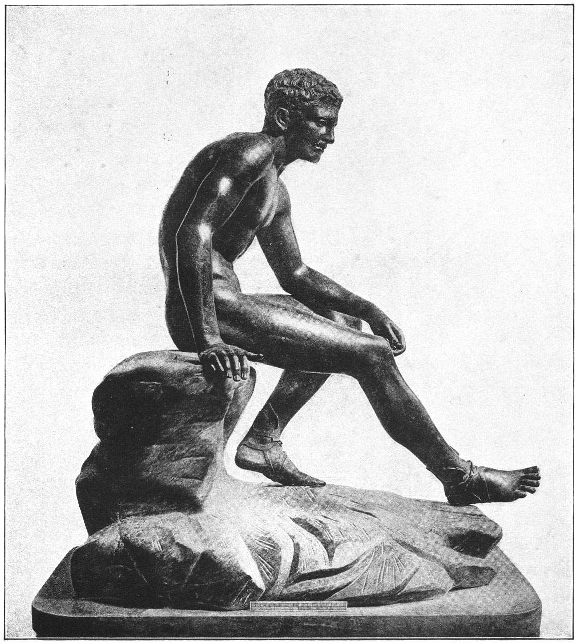 waarin niemand op het geheele eiland den grooten koning zou vermoeden. Zij beroerde hem met haar staf en terstond schrompelde het krachtige vleesch ineen, de huid werd stram en vol rimpels, de trotsche nek boog zich, het bruine, weelderige haar viel uit en mat keken de oogen, die even te voren nog schitterden van jeugdig vuur. De lange, schitterende kleedij, die in breede plooien sierlijk zijn lichaam omgaf, werd tot een gelapte, vuile kiel, en als mantel hing een oud, versleten schaapsvel [113]over zijn schouders. Ter voltooiing van het bedelaarspak schonk zij hem nog een viezen, met moeite samengehouden knapzak en gaf hem een knoestigen stok in de hand. In deze uitrusting beval zij hem den zwijnenhoeder op te zoeken, die een der trouwste aanhangers van het koninklijk huis en een aartsvijand van de vrijers was; van hem zou hij spoedig meer vernemen; zelve wilde de godin intusschen den jongen Telèmachos tegemoet snellen, die juist Sparta zou verlaten, en op wiens verderf de vrijers loerden. Zij zou hun lagen verijdelen en hoopte weldra den jongen man in ’s vaders armen te kunnen voeren.