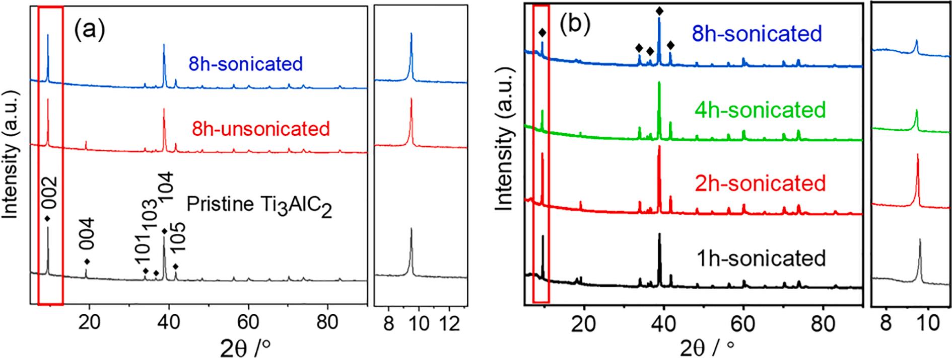 Fig. 1(a) depicts the XRD patterns of the pristine Ti3Al2C2 powder and the etched samples in absence and in presence of sonication. It is vividly shown that the etched samples hold the same crystal structure as the corresponding Ti3Al2C2. Naguib and coworkers [19] etched the Ti3Al2C2 by using 50% hydrofluoric acid, it was reported that the stoichiometry and crystal structure of the resultant Ti3C2Tx powder was consistent with the pristine Ti3AlC2 MAX phase except for the Al atomic layer, which is in good agreement with the results in the present work. As shown in Fig. 1(a), the characteristic (0 0 2) peaks of as-prepared MXene shifted from 9.6◦ in the Ti3AlC2 powder to a lower 2θ angle of 9.5◦ after 8 h of etching treatment in absence of ultrasound, and it further shifts to 9.4◦ when the ultrasound is present. According to the Bragg’s law [20], this is an indication of an increase in interlayer spacing due to the removal of Al and introduction of surface terminations (represented as Tx) in Ti3C2Tx (e.g., -F, -O, –OH) in the wet-chemical etching of Ti3AlC2 Additionally, the intensity of decrease with
