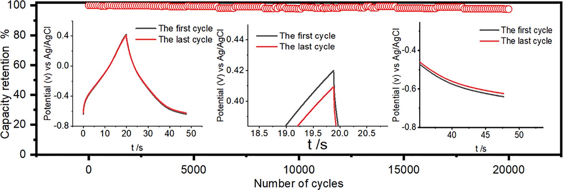 Apart from specific capacitance, cycling stability is attractive merit of electrochemical capacitors, it is a key factor to determine the potential of the electrode material for practical applications. Herein, GCD experiments were performed for 20,000 cycles at 5 A/g to determine the cycling stability of the MXene, the results are shown in Fig. 7, inset of Fig. 7 shows the profile of the first and the last cycles of GCD curves. The