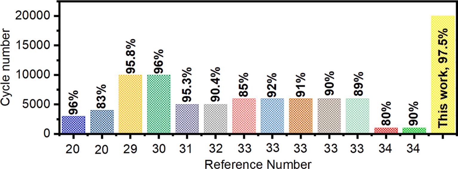 capacitance retention of the electrode is 97.5% after 20,000 cycles of test, which is overwhelming stability compared with the previously reported MXene or MXene-based materials. Fig. 8 shows the comparison of the capacity retention of the as-prepared 8 h-sonicated sample with previously reported MXene or MXene-based materials [20,29,30,31,32,33,34]