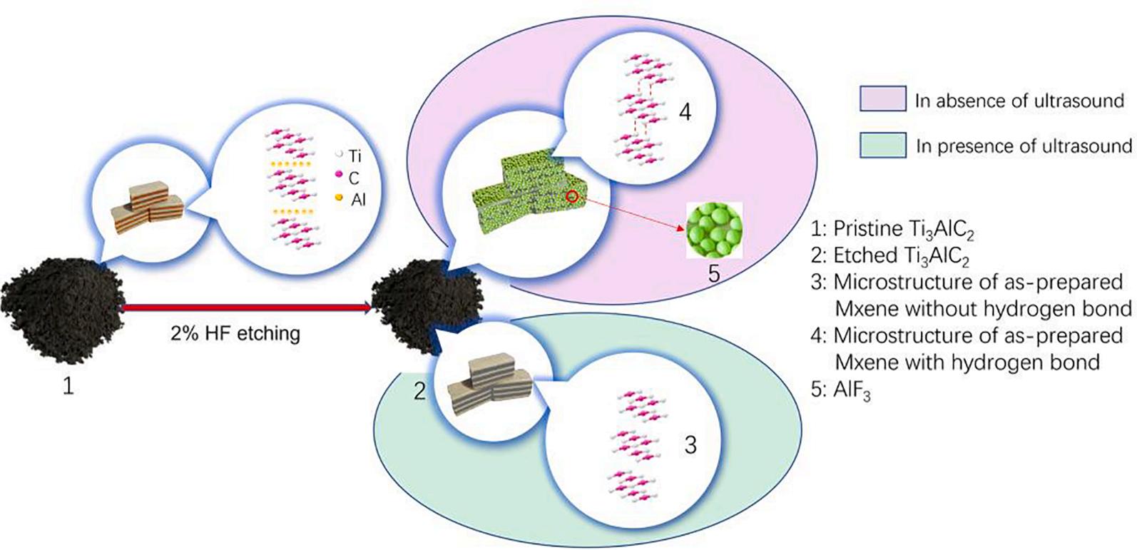 aluminum extraction from Ti3AlC2 in 50% hydrofluoric acid, it was found that at least 15 h were needed to complete removal of Al from Ti3AlC2 In-situ HF forming systems for Ti3AlC2, such as high concentration of LiF/HCl and NH4HF2, which inherently use HF as the active reagent for etching of Ti3AlC2, even showed lower efficiency in removal of Al than fluohydric acid. The etching efficiency has been significantly improved in the present work. Additionally, the lowest concentration of fluohydric acid to prepare Ti3C2Tx MXene is 5% to date, the concentration of fluohydric acid is further decreased to 2% in this study, while better performance of the products is achieved, thanks to the applied ultrasound.