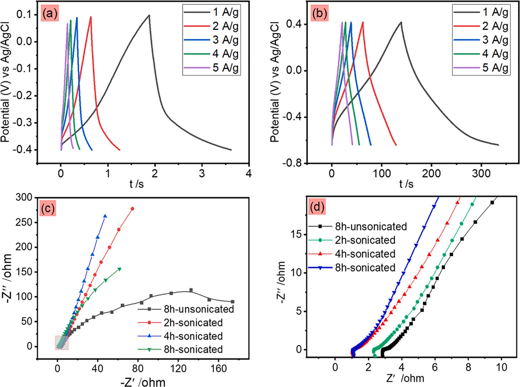 6. GCD curves of the prepared samples with current density from 1 to 5 A/g; (a) 8 h-unsonicated; (b) 8 h-sonicated; (c) Nyquist plots of 8 h-unsonicated, 2 hsonicated, 4 h-sonicated, and 8 h-sonicated electrodes, (d): the magnified section in the low frequency of Fig. 6(c).