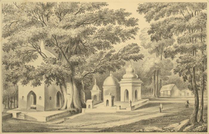 In Alopee Bagh, in the centre of a large plantation of mango-trees, is a small temple dedicated to Bhawānī; there is no image in it, merely a raised altar, on which victims were, I suppose, formerly sacrificed. Each of the small buildings on the right contains the ashes of a suttee; there are seven suttee-graves of masonry on this, and six of earth on the other side, near the temple, in the mango tope. The largest suttee-tomb contains the ashes of a woman who was burnt in 1825, i.e.six years ago. The ashes are always buried near a temple sacred to Bhāwanī, and never by any other. Families too poor to raise a tomb of masonry in memory of the burntsacrifice, are contented to raise a mound of earth, and place a kulsa of red earthenware to mark the spot. In the sketch of “The
