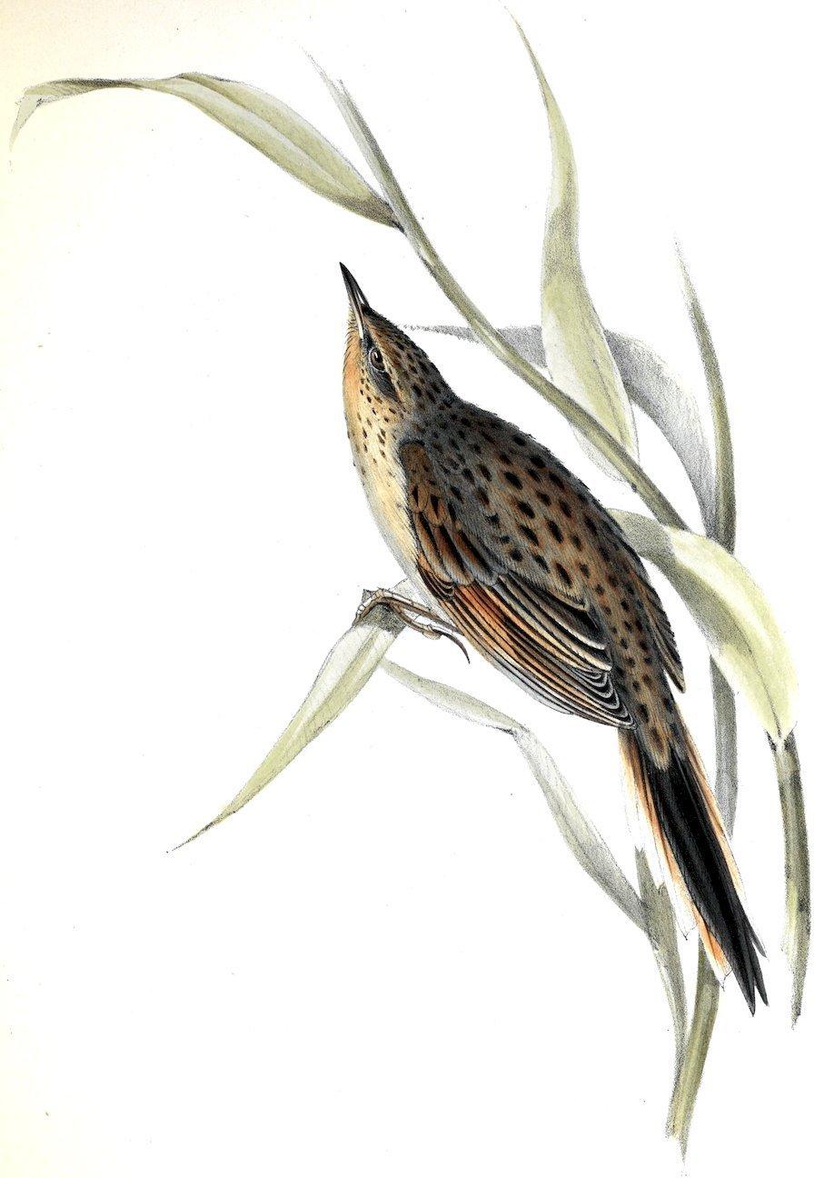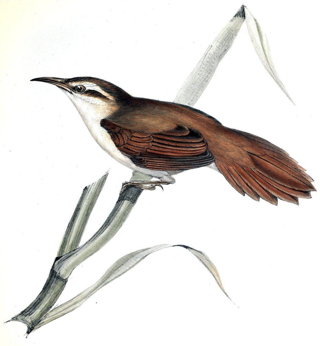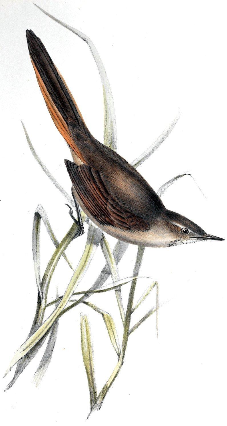 This bird, though forming a well-marked genus, is in many respects, even in plumage, allied to Furnarius and Opetiorhynchus,— for instance, in the streak over its eyes, in the red band on its wings extending obliquely from the body to the third primary, and to some of the species of these genera in its rather plumose feathers. In its general manners, the same resemblance, together with some differences, always struck me. It lives entirely on the ground, and generally in dry sterile situations, where it haunts the scattered thickets, and often flies from one to another. When skulking about the bushes it cocks up its tail, imitating in this respect Pteroptochos and Rhinomya. Its cry is shrill, quickly reiterated, and very similar to that of several species of Furnarius and Opetiorhynchus. The stomach of one which I opened was full of Coleoptera. I procured specimens from three places on the coast of Patagonia; namely, Port Desire, St. Julian, and Santa Cruz; but it is nowhere common. I likewise saw it at a considerable elevation in the eastern valleys of the barren Cordillera, near Mendoza.