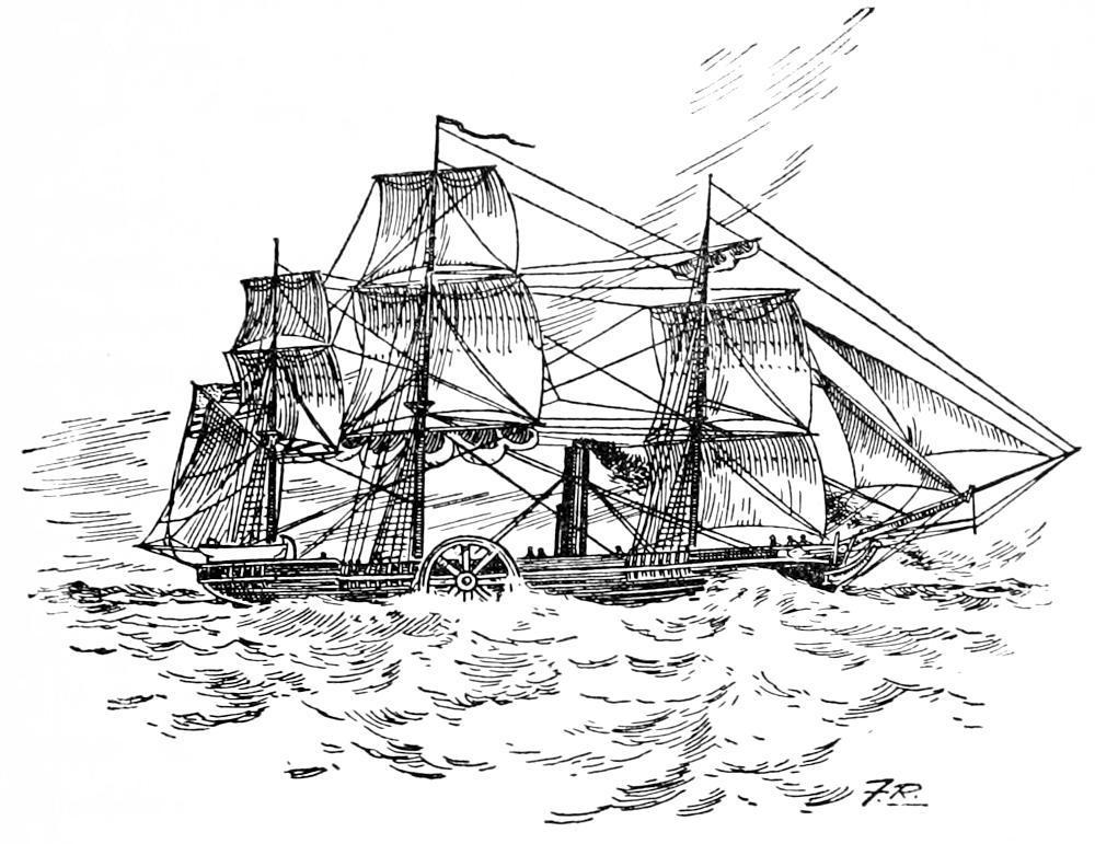 During the next decade a number of boats and small ships were built, in the hulls of which steam engines were placed, and on the masts of which the ever-present sails were spread to guard against what were, evidently, the inevitable breakdowns. But another step in the development of steamships was to be made. Up to 1818 steamdriven ships had been used only on inland or on coastal waters. But in that year a 380-ton full-rigged ship was built in New York City and was equipped with paddle-wheels operated by a steam engine of seventy-two horse power. (Some say this engine developed ninety horse power but the measurement of the power of engines was then at best an inaccurate science.)