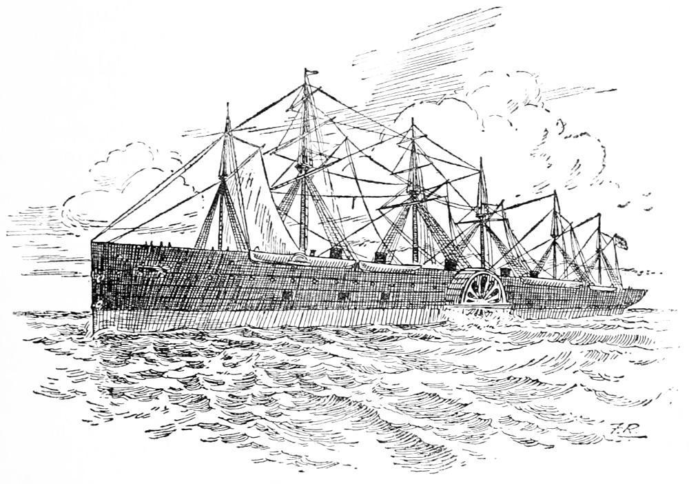 This great ship was equipped with six masts, each capable of carrying sail, five funnels, two paddle-wheels, and a propeller. She
